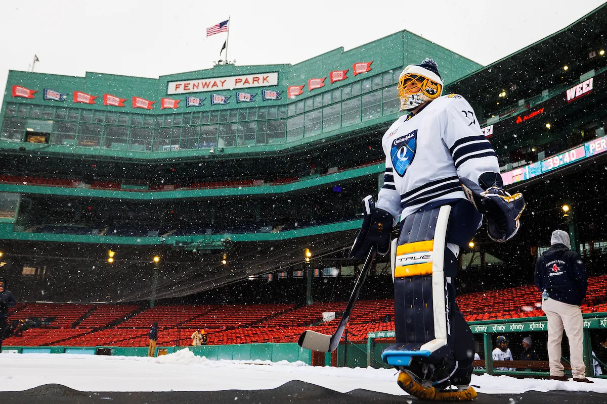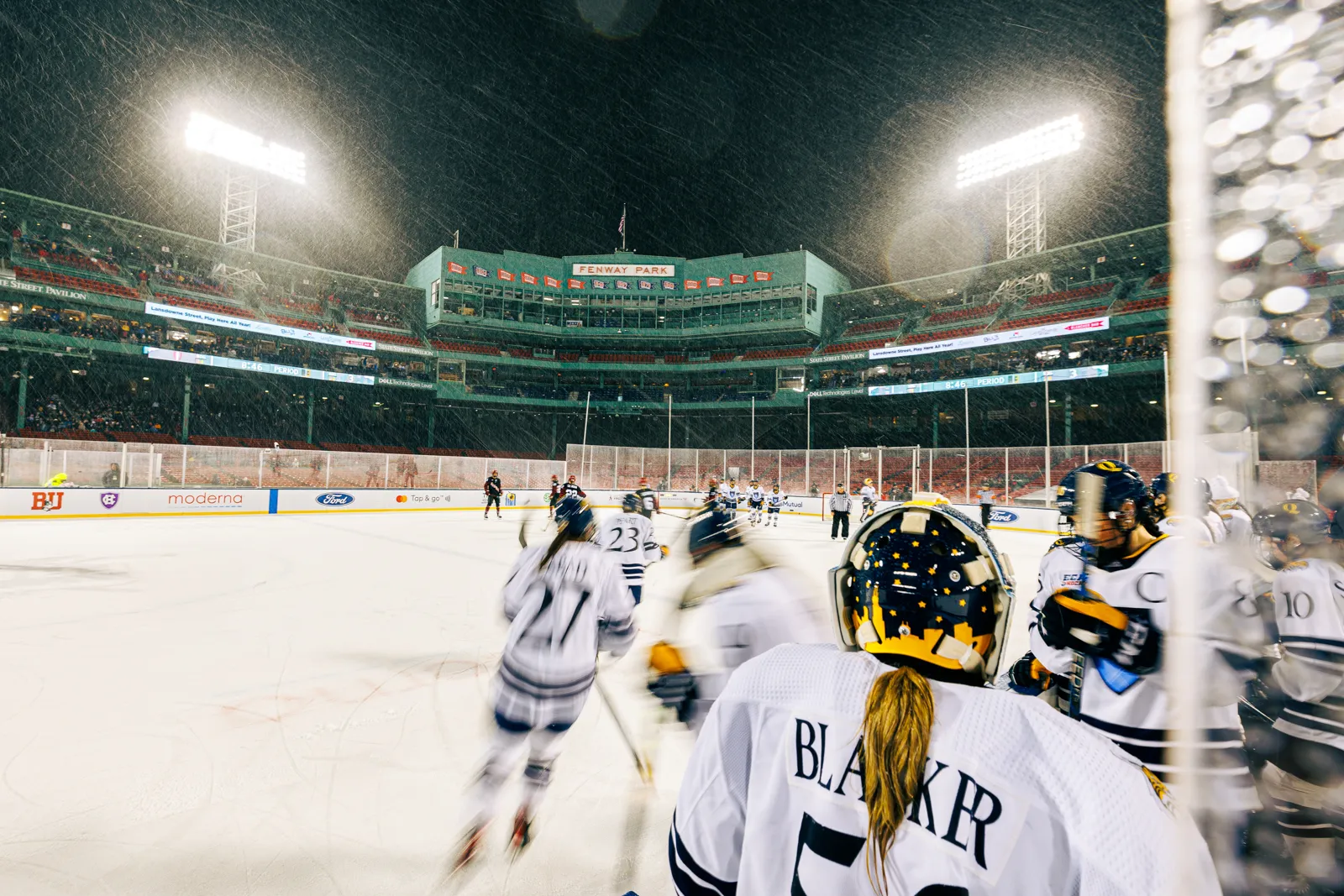 Quinnipiac Women’s Ice Hockey takes on Harvard at Fenway Park in Boston for Frozen Fenway, during a snowy Friday afternoon on Jan. 6, 2023.