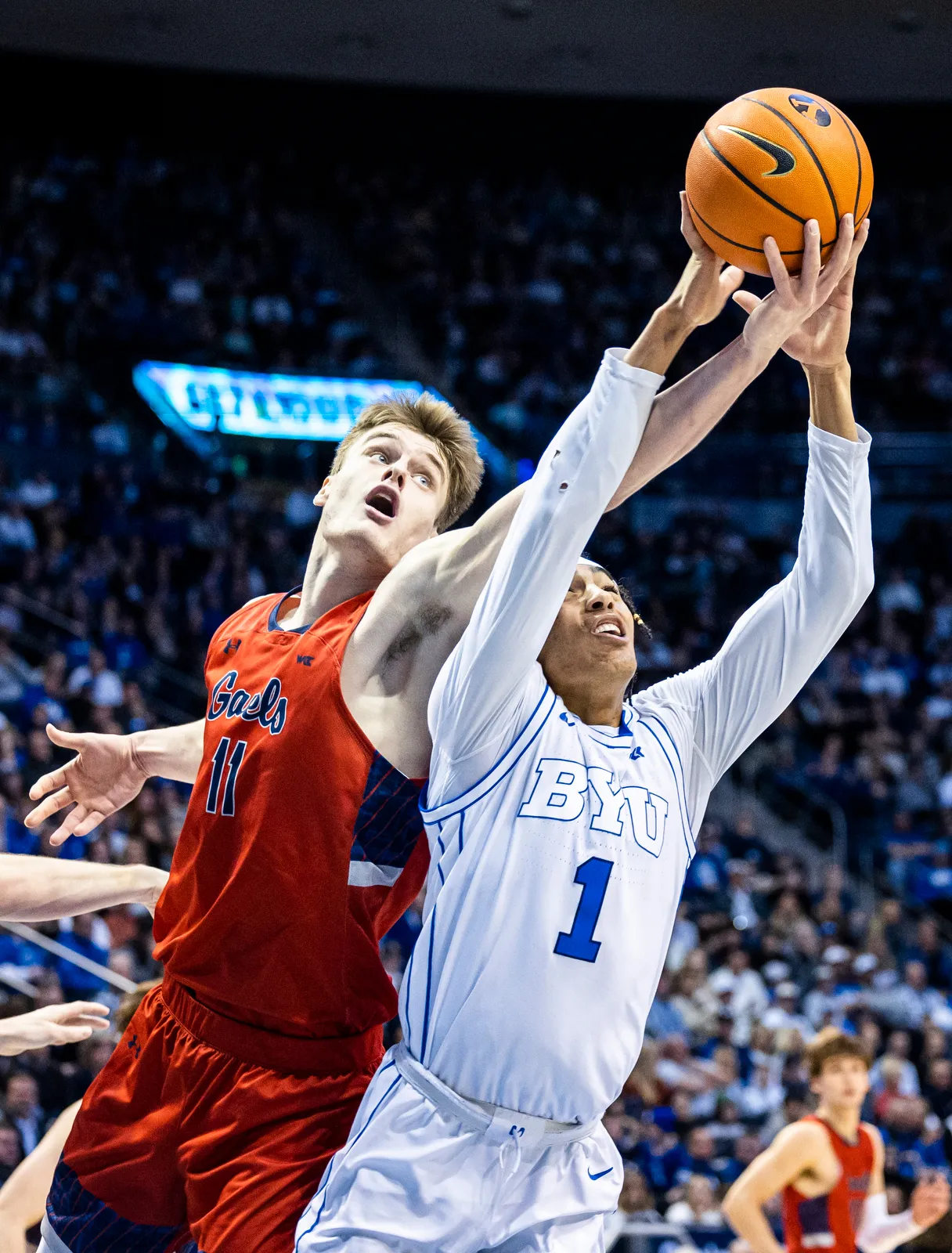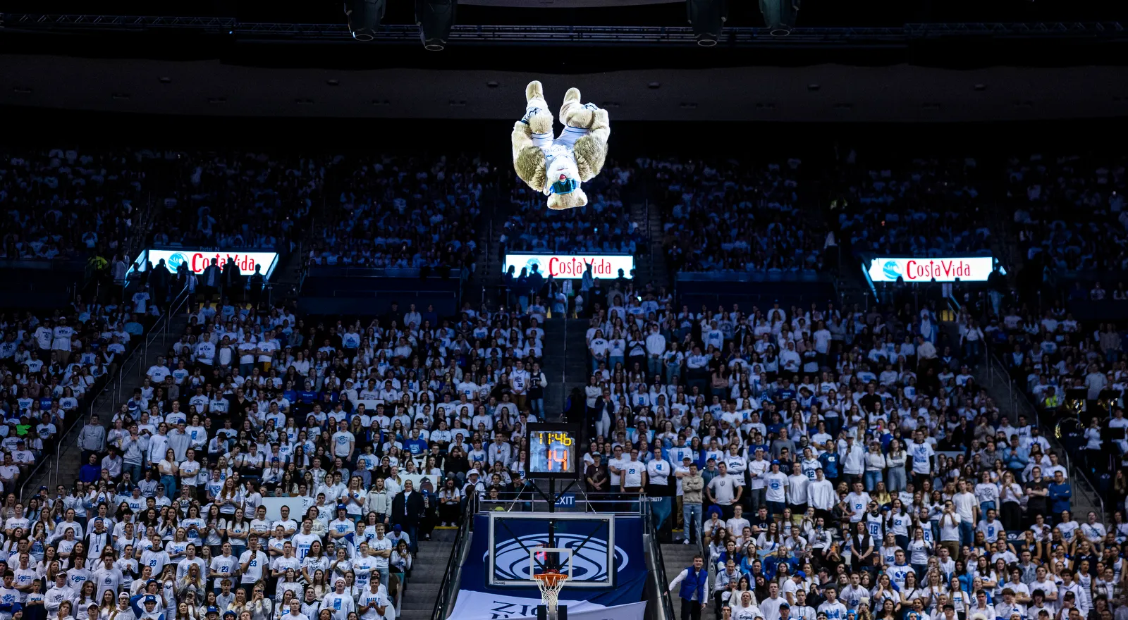 Cosmo the Cougar flips in the air during the halftime show at a basketball game.