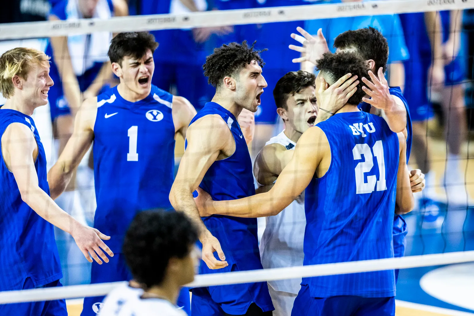 The BYU men's volleyball team celebrates after scoring on the opposing team.