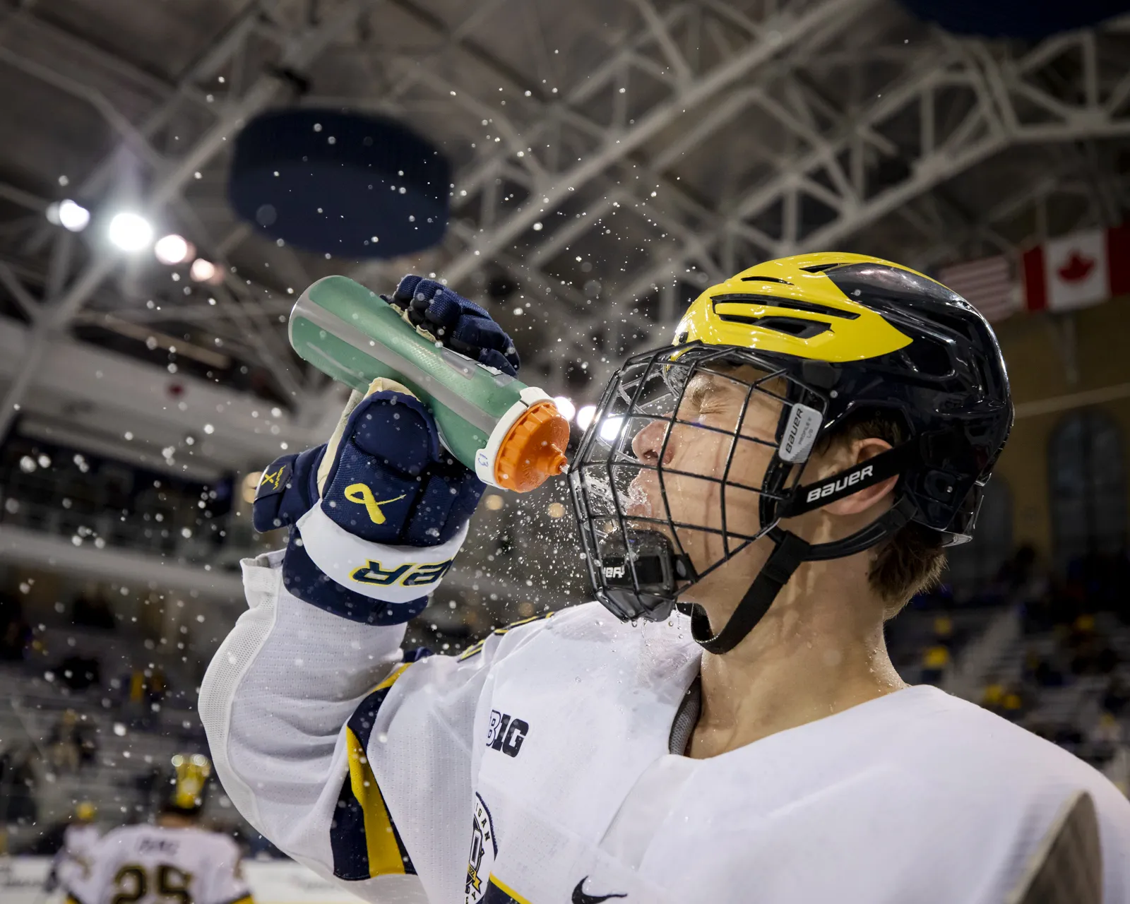 From behind the Michigan Hockey bench, a player splashes himself with water during warmups.