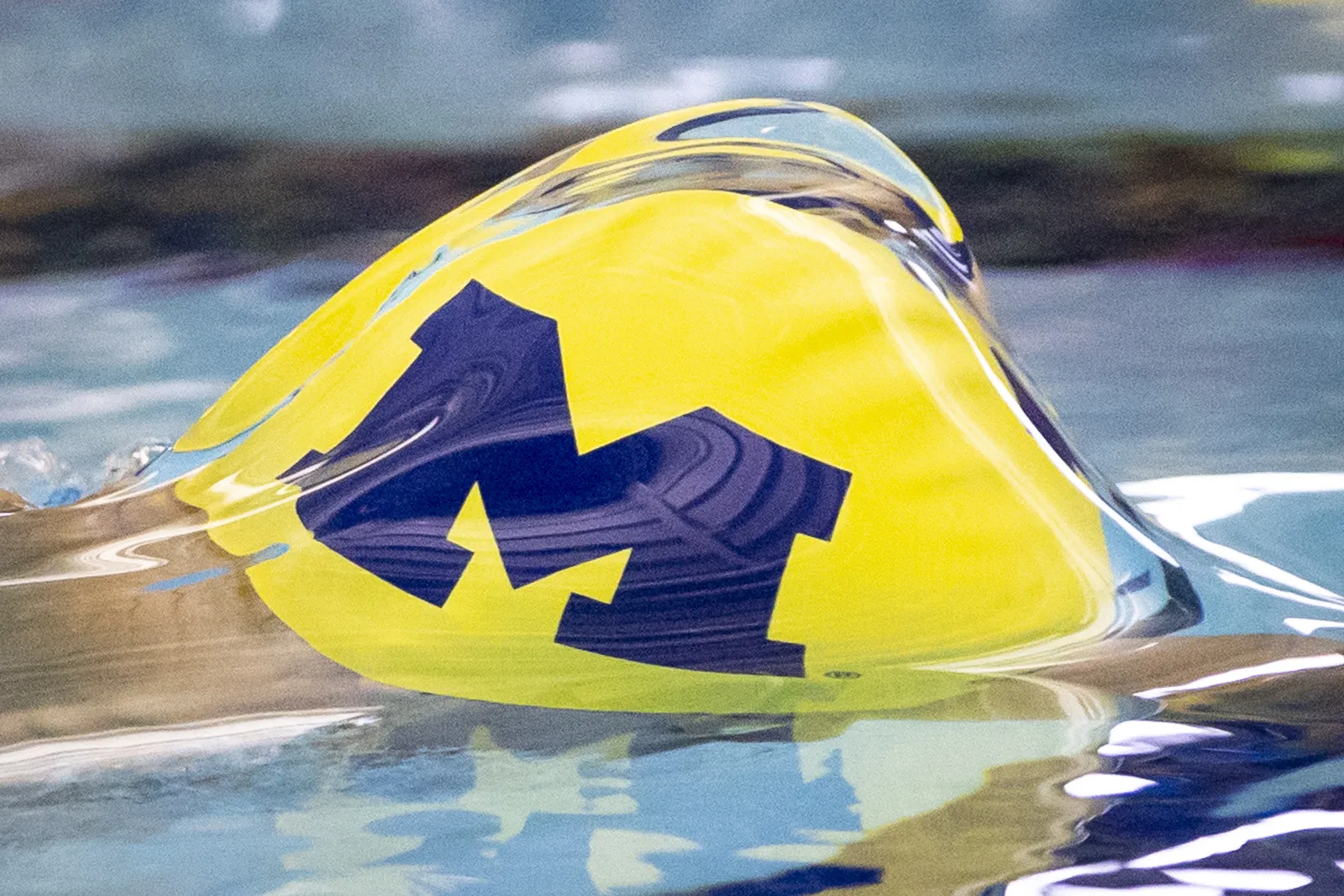 A University of Michigan swimmer breaks the surface after diving in the water.