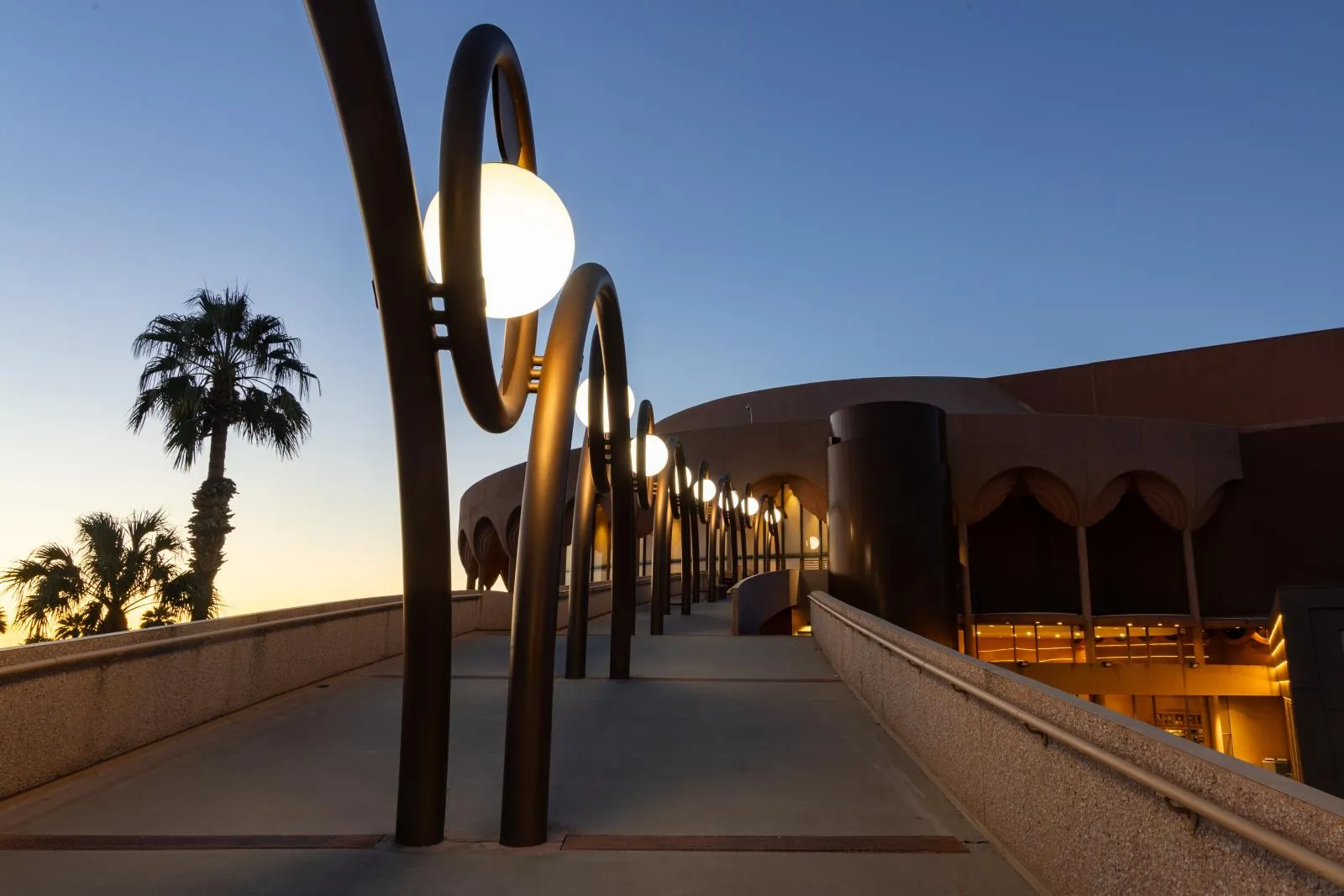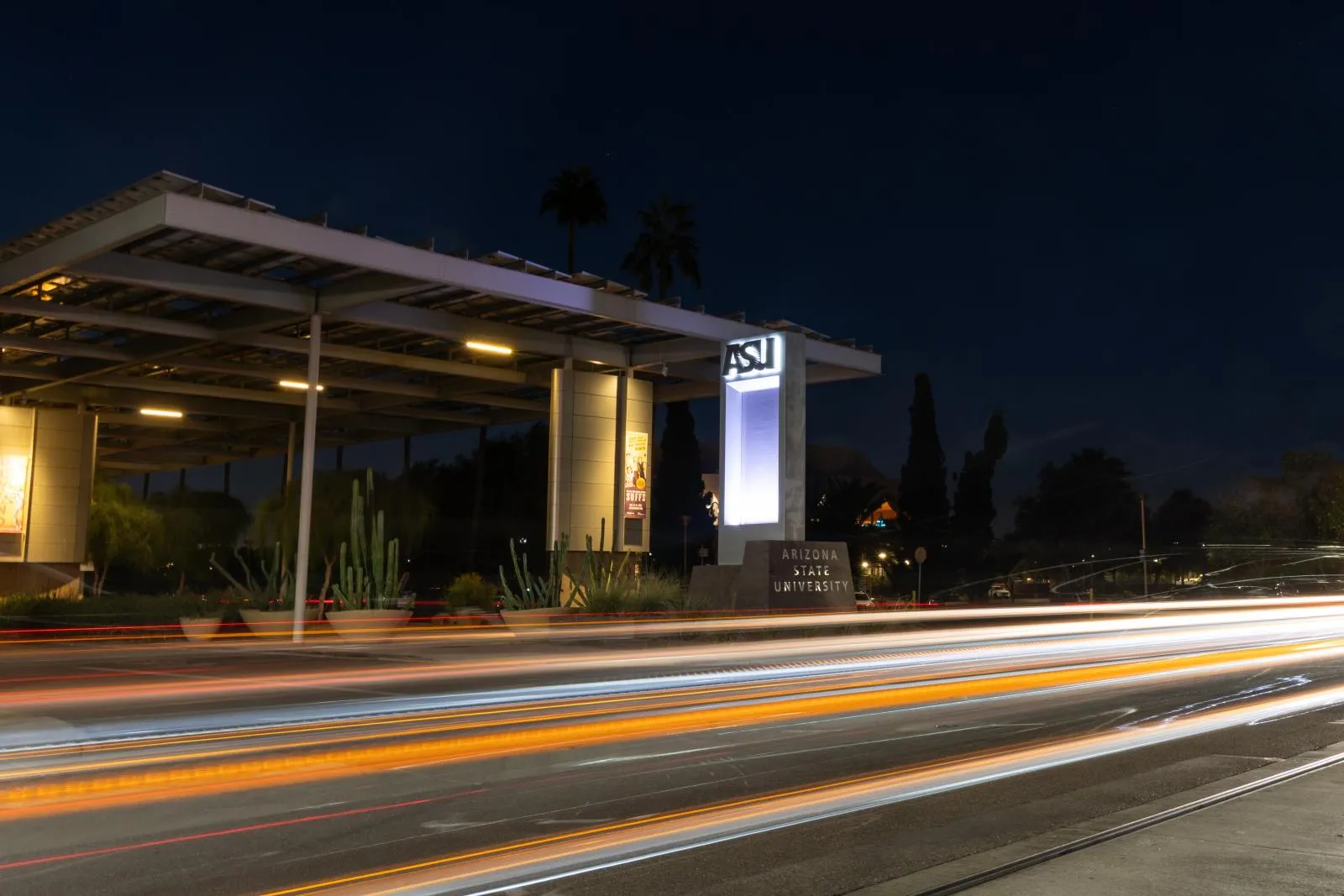 A view of an ASU sign near Gammage as cars pass by in Tempe, Ariz.