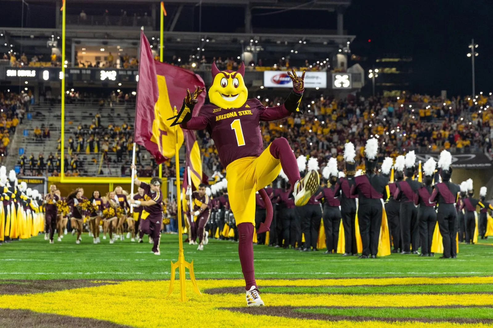 Sparky runs out during the "Stomp the Bus" tradition during the ASU vs. U of A Territorial Cup game at Mountain America Stadium in Tempe, Ariz.