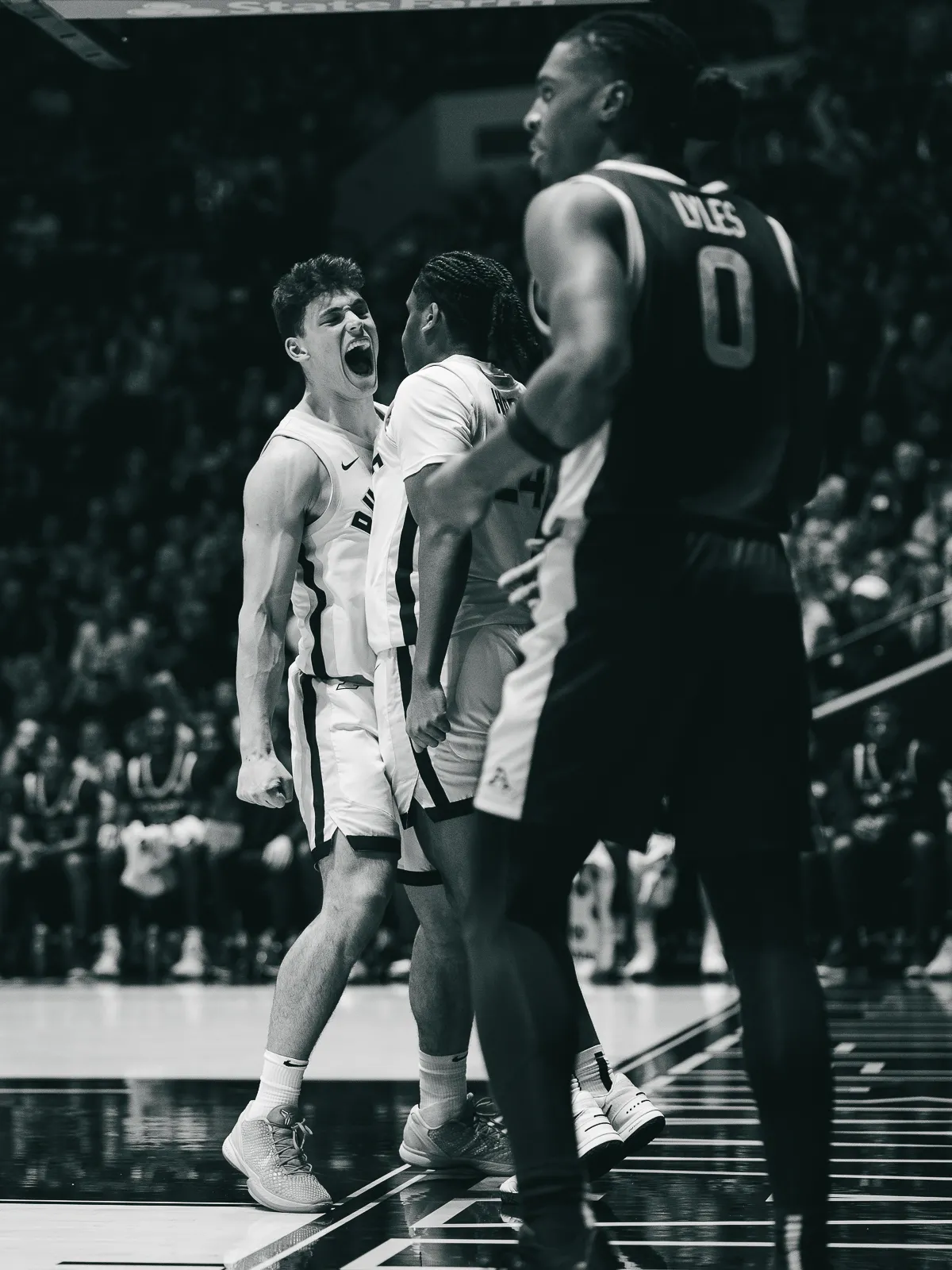 Freshman point guard Omer Mayer of the Purdue Boilermakers celebrates an and-1 point with his teammate sophomore shooting guard Gicarri Harris.