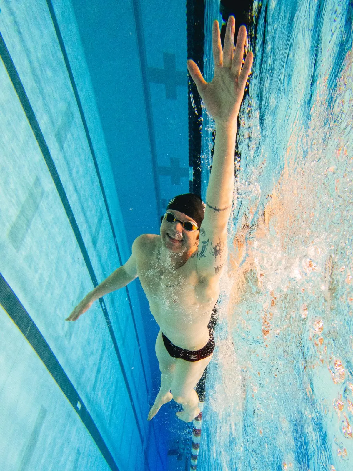 Swimmer on the UW-Madison team spots me underwater during practice and smiles at the camera.