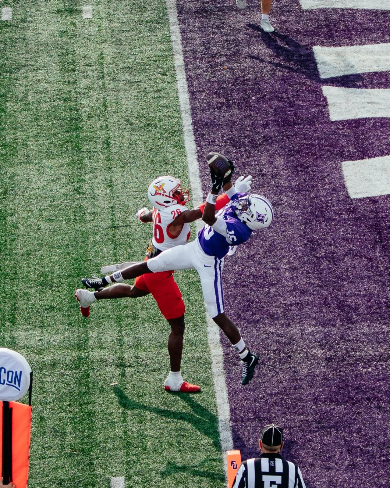 Birds eye view of freshman wide receiver Evan James catch a game-changing touchdown against VMI.