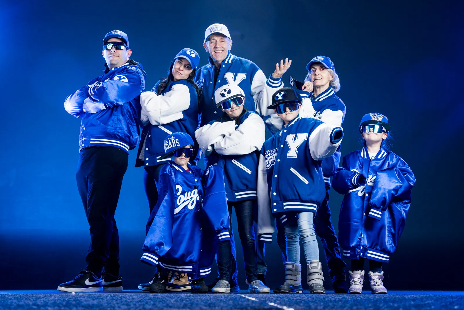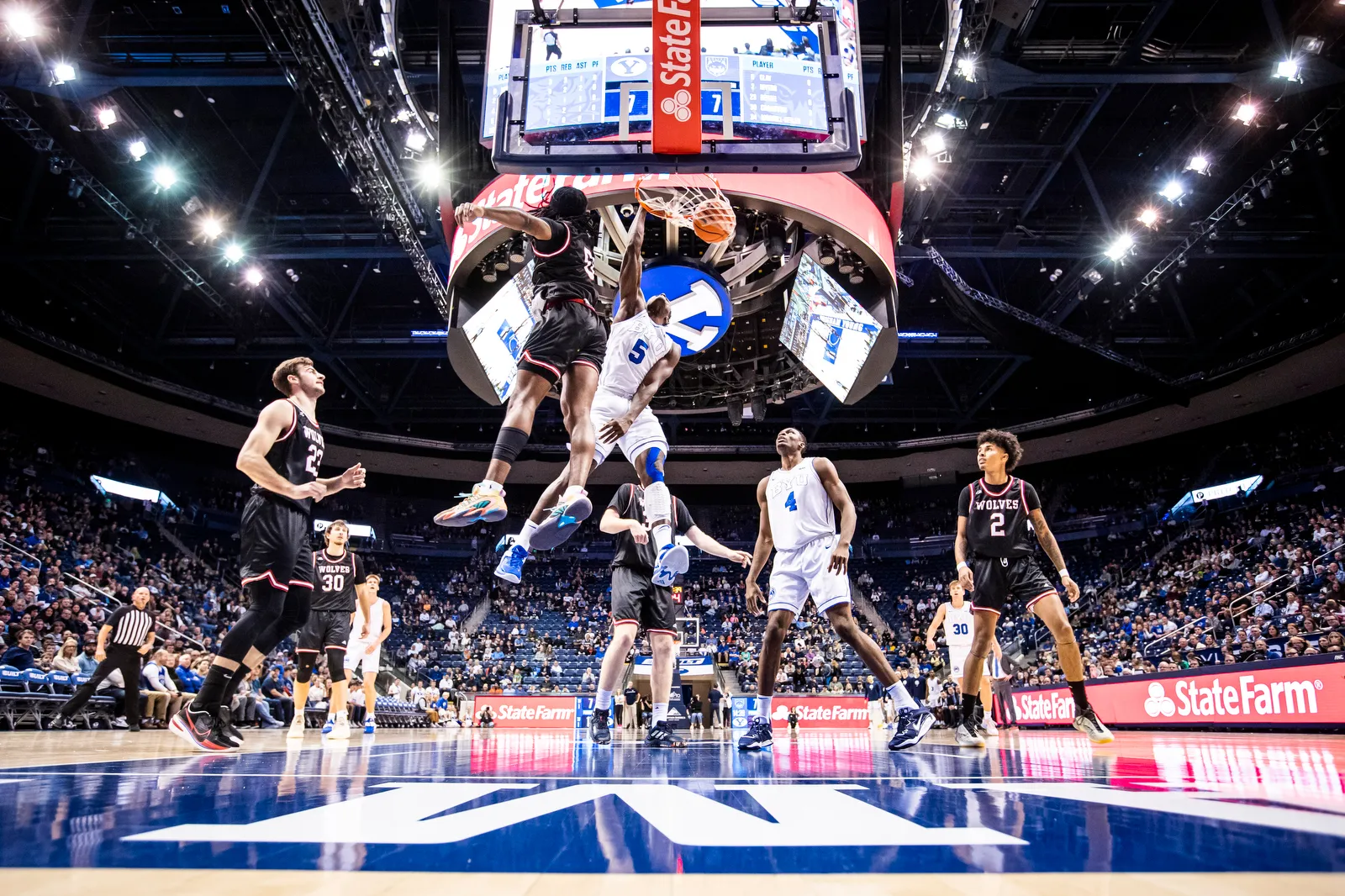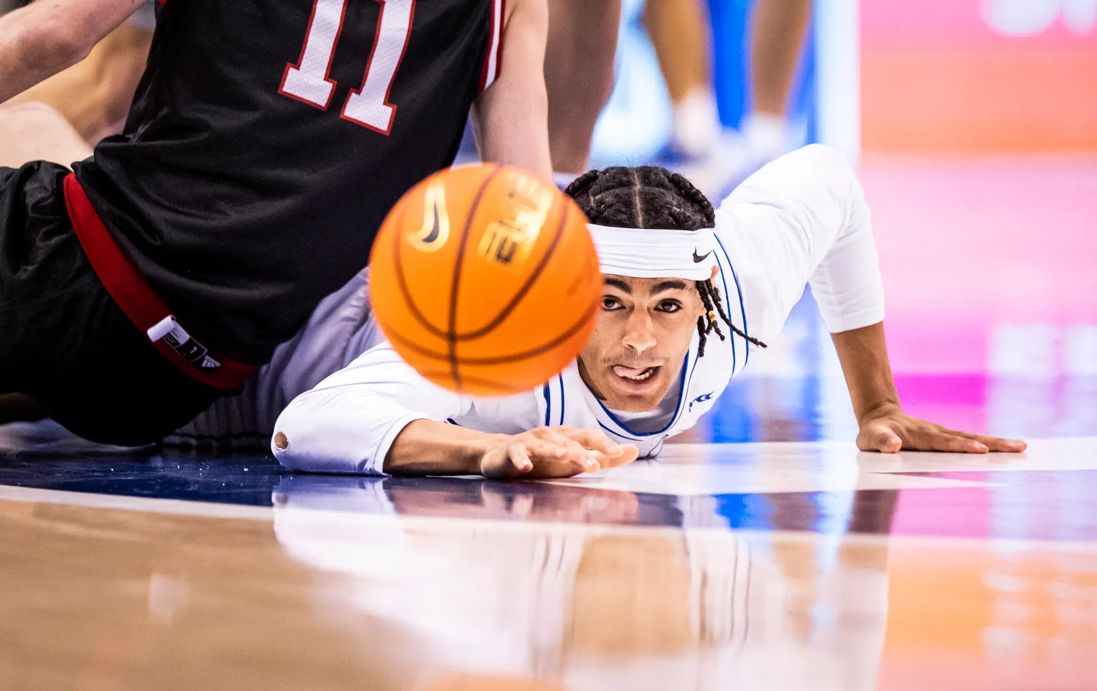 A BYU Basketball player tries to steal the ball from the opposing team while on the ground.