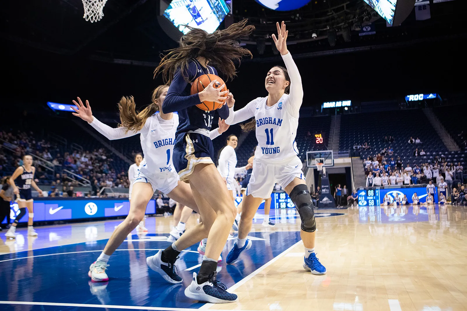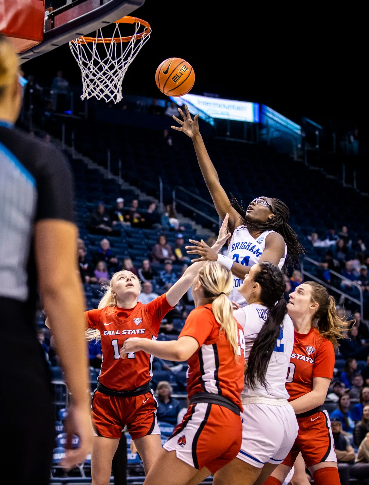 A BYU Women's Basketball player jumps above the rest of the athletes to score.