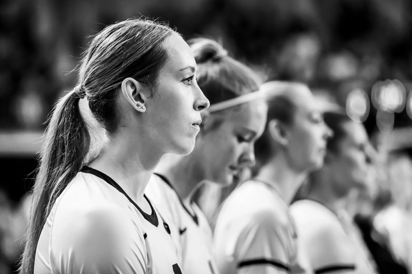 The BYU Women's Volleyball team solemnly waits for the starting lineup to be called at a game.