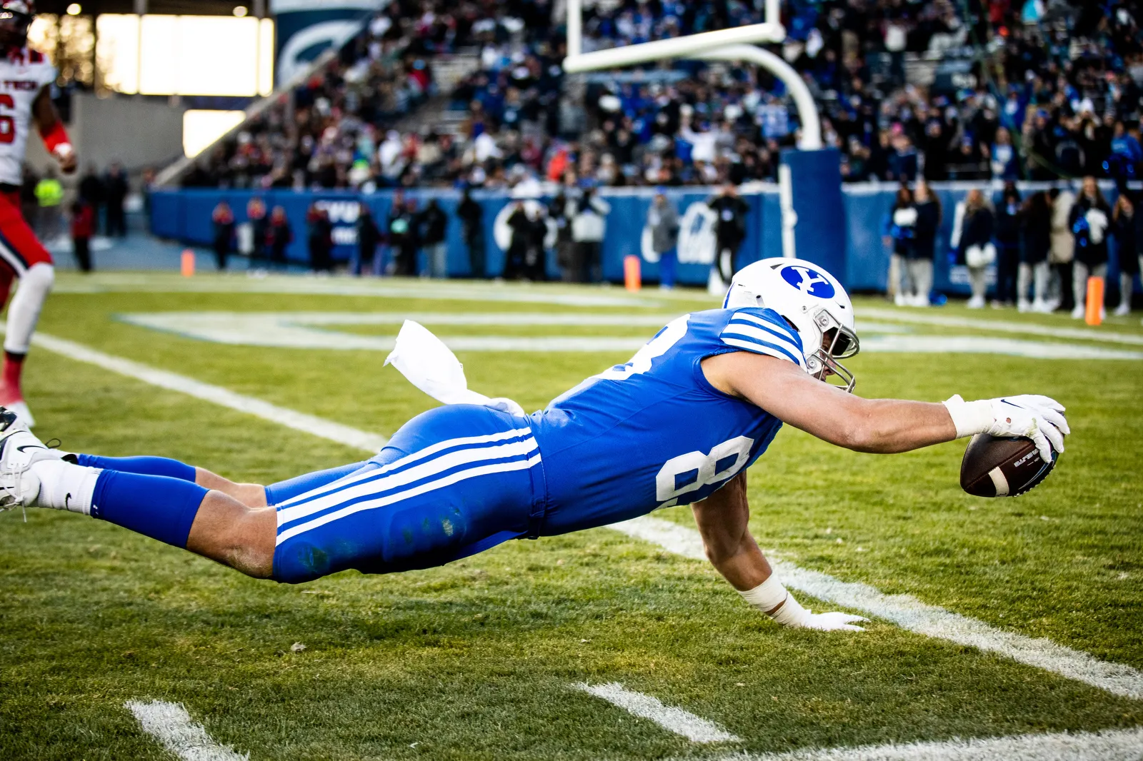 A BYU Football player makes a huge dive towards the endzone to score for his team