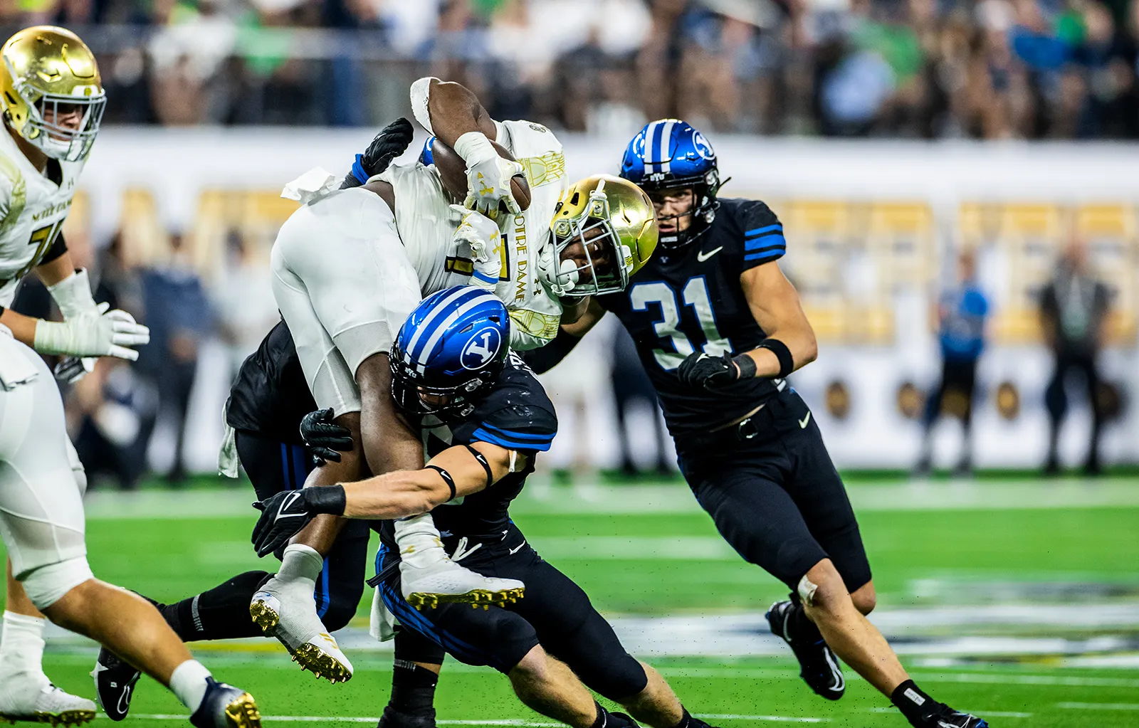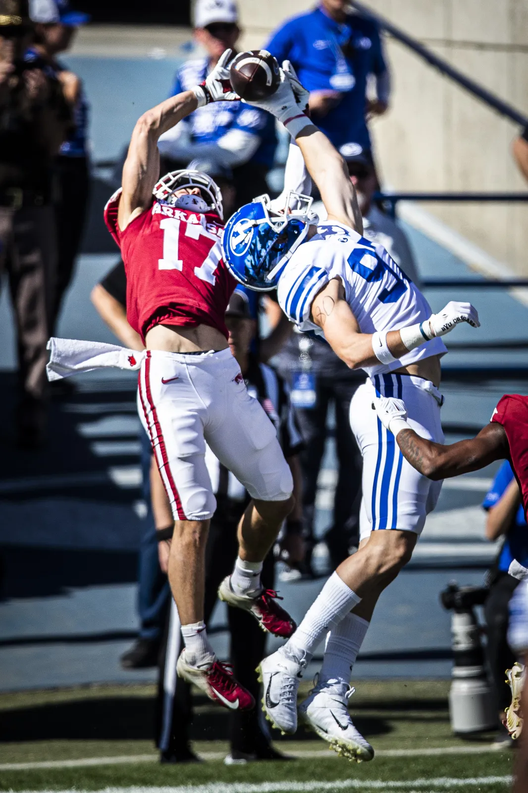 A BYU football player reaches up and behind his back to catch the ball with one hand as the opposing team tries to pick off the pass.