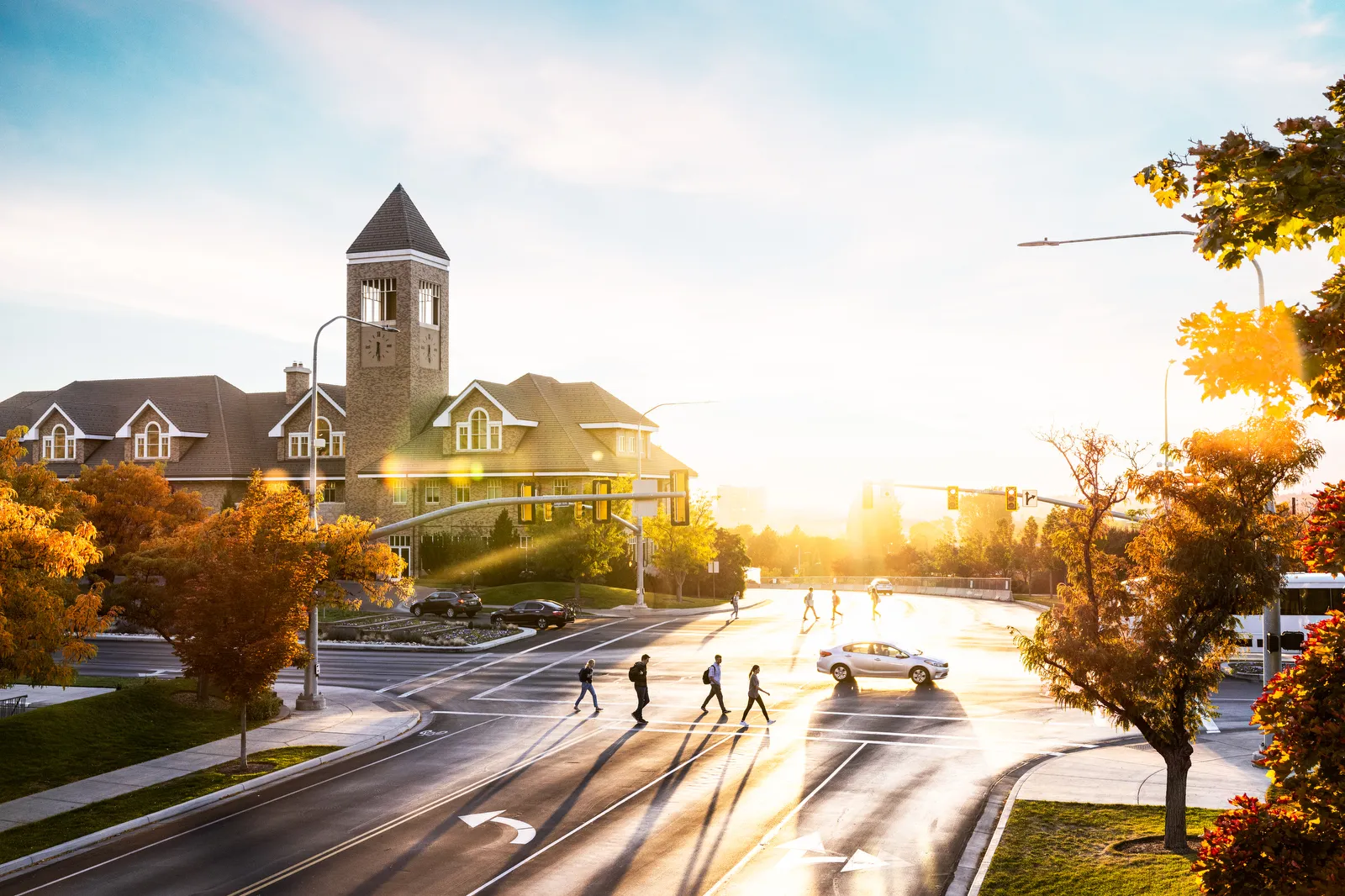 This photo illustration showcases the beautiful BYU campus fall colors as the sun sets in the distance.