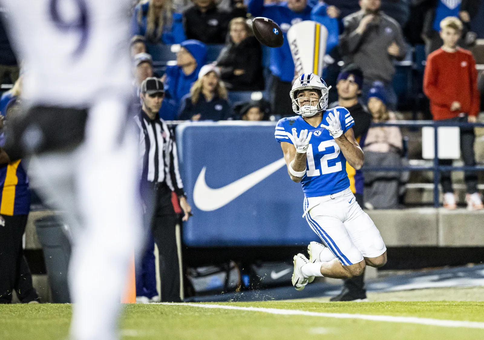 BYU Football wide receiver Puka Nacua jumps in the air to catch a ball as he enters the end zone. He would catch the ball and score for BYU on this play.