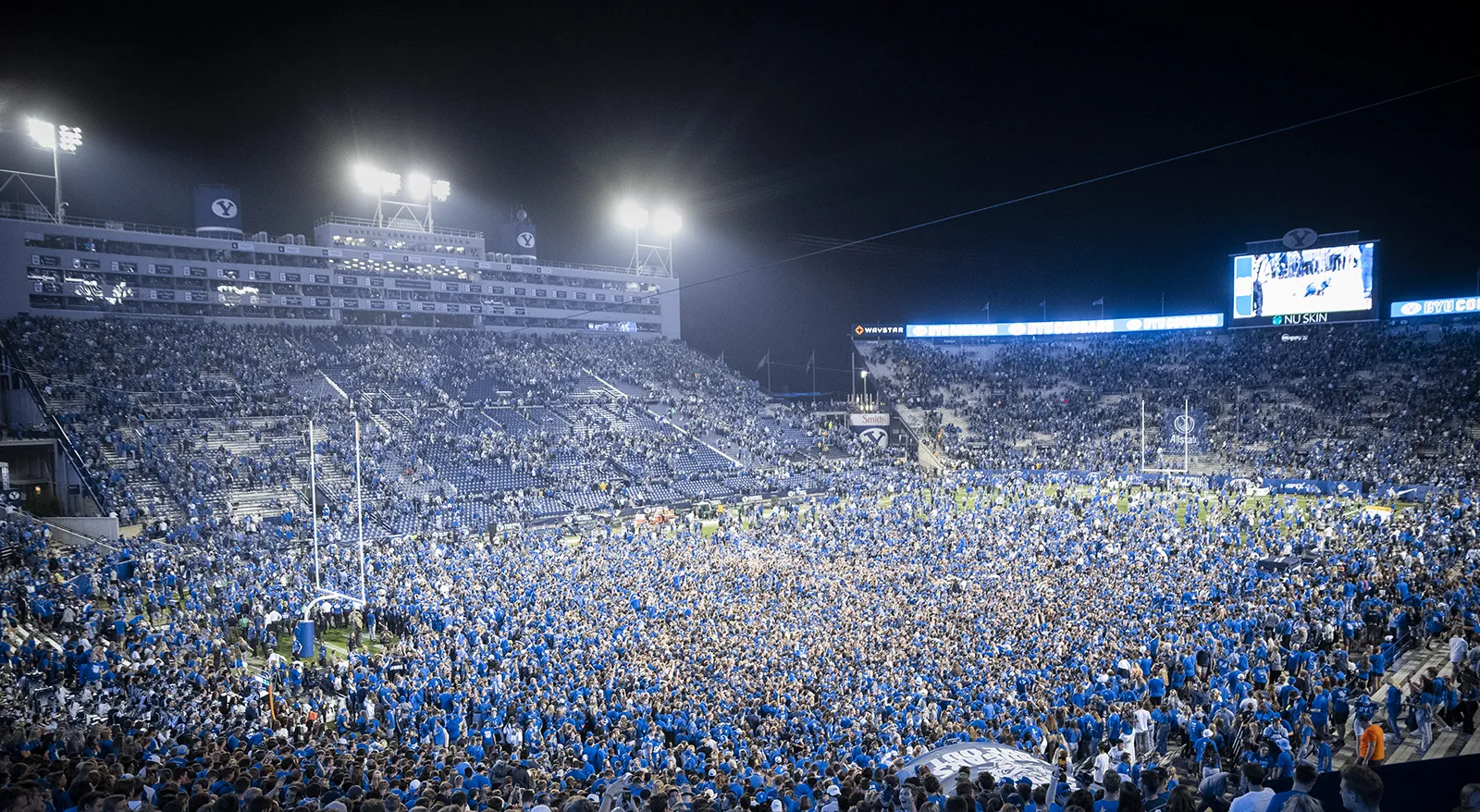 Rushing the field, BYU students and fans empty the stands after BYU's victory against Baylor University on September 11th. BYU beat Baylor 26-20 in double overtime.