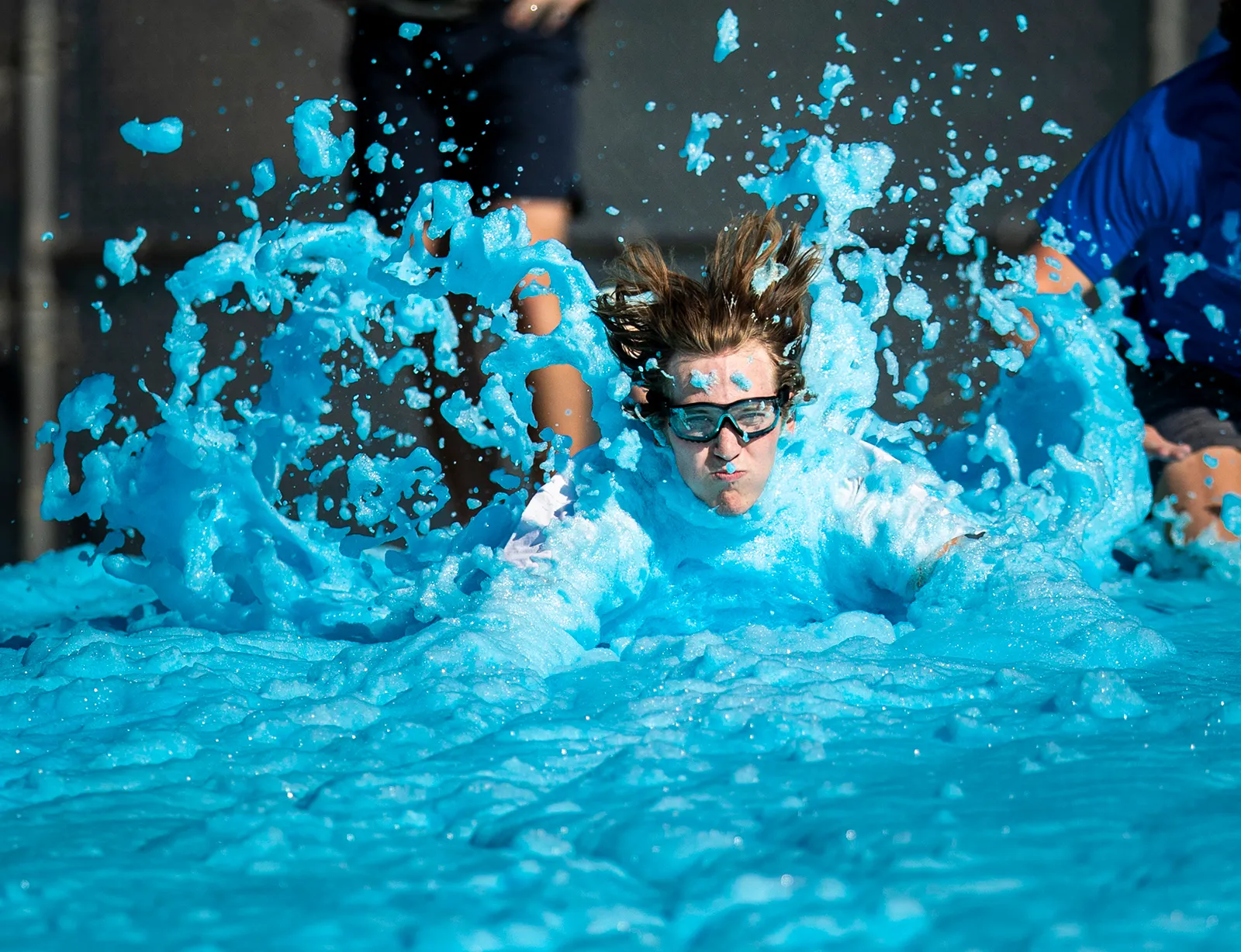As part of the new-semester festivities, freshman and upperclassmen alike take turns flying down a massive green hill covered in blue, soapy foam.