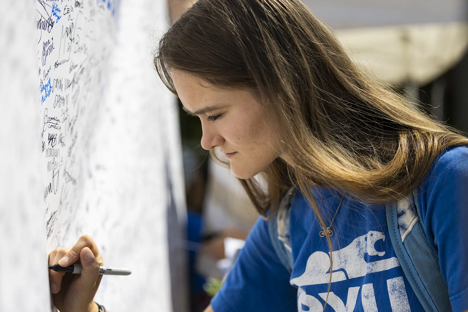 Sharpie in hand, a BYU student writes her signature. BYU's Office of Belonging hosted their opening event on September 12th, asking students to sign a commitment to abide by their statement of belonging.