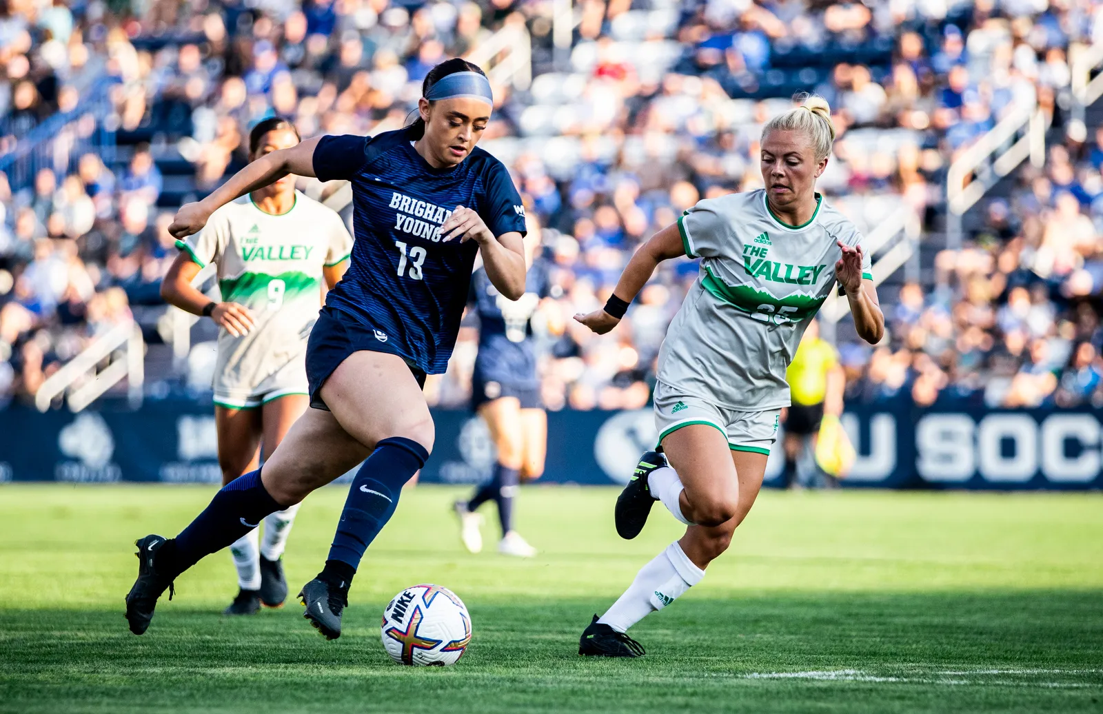 A BYU women's soccer player rushes to score while the opposing team follows closely behind.