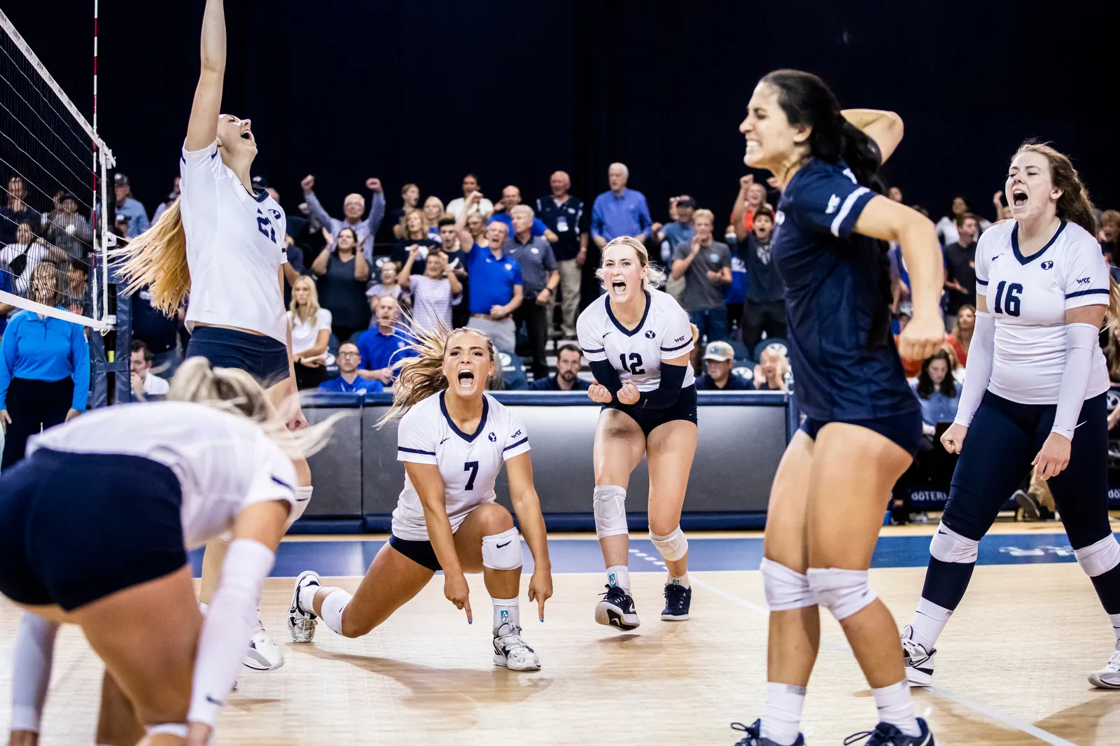The BYU Women's volleyball team celebrates a big win over their opponent. This game was historic for head coach Heather Olmstead, who is now the fastest D1 women's volleyball coach to reach 200 career wins ever, accomplishing this feat in just 225 games.