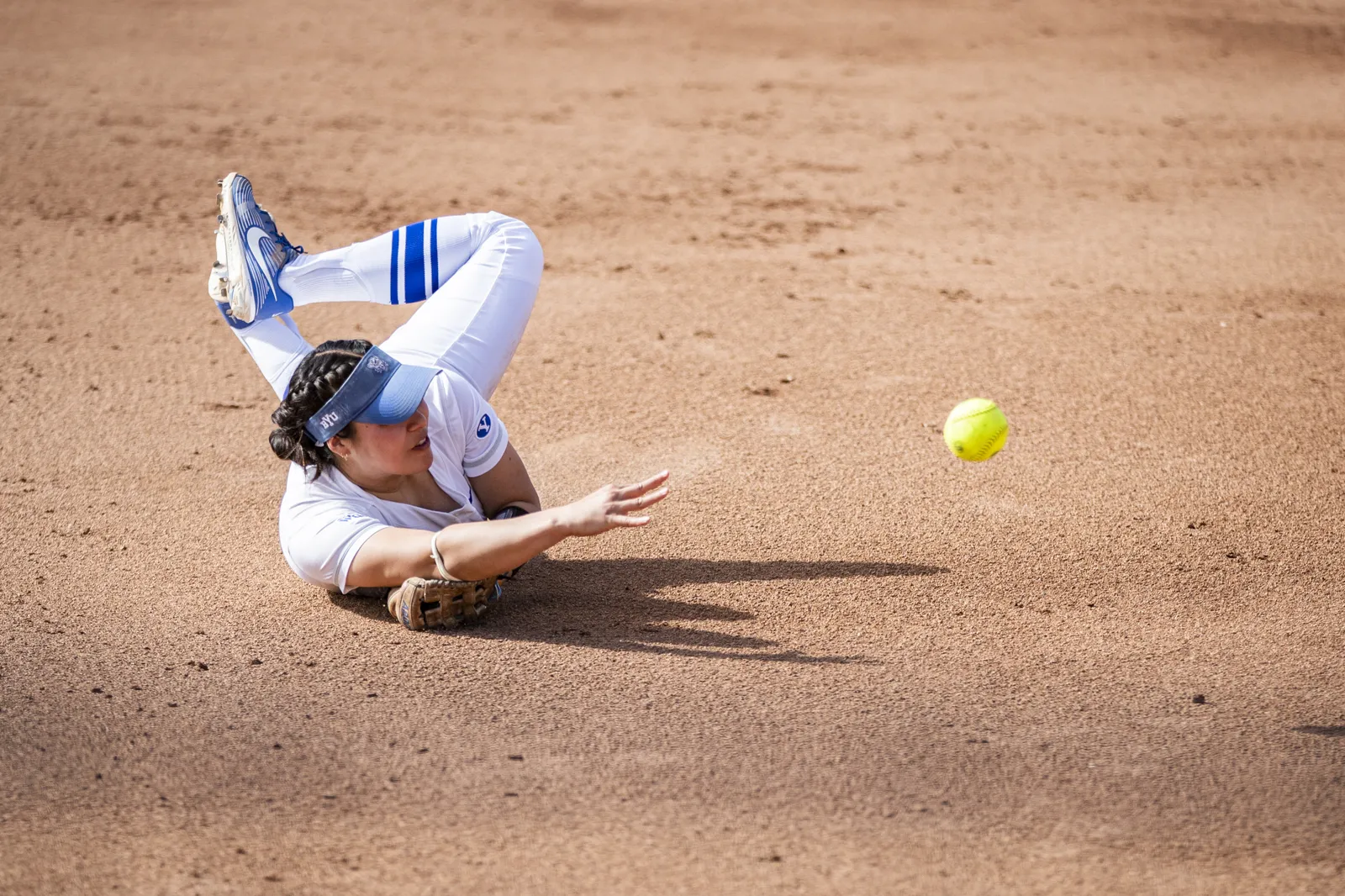 A BYU softball player dives to catch a grounded ball and quickly throws it to third to make a play.