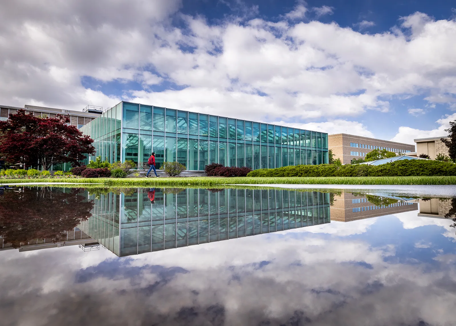 Student walking on campus in front of the library one spring morning.