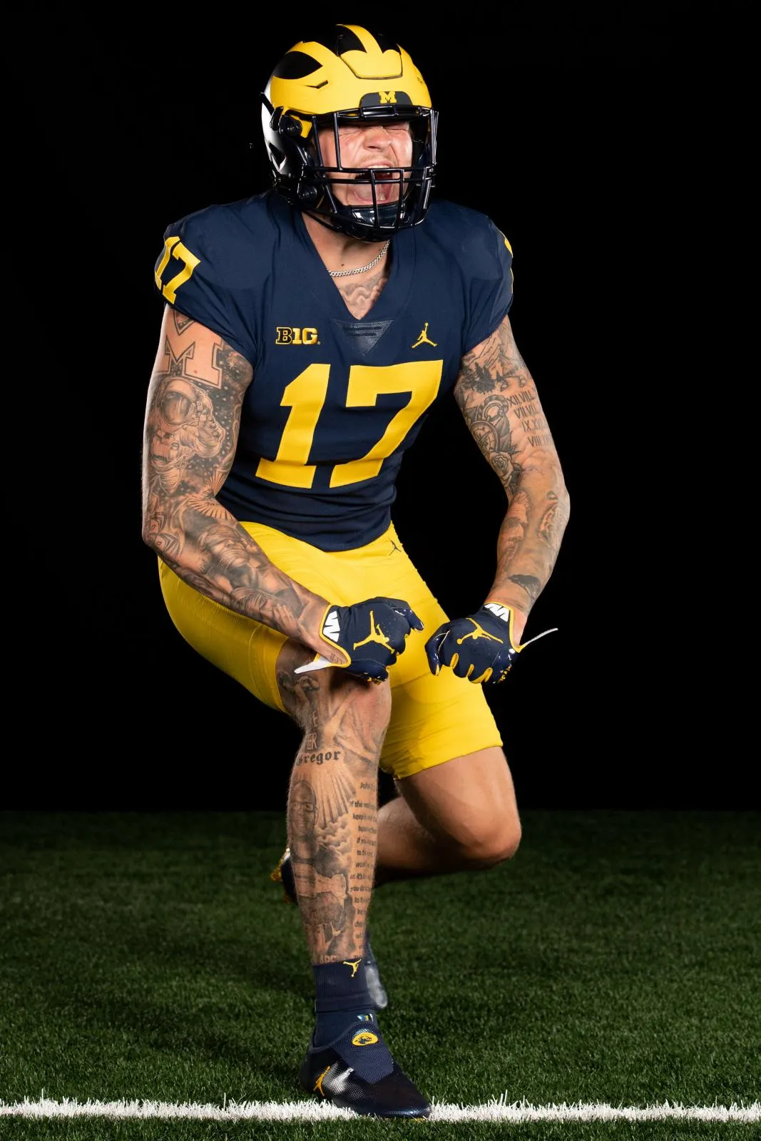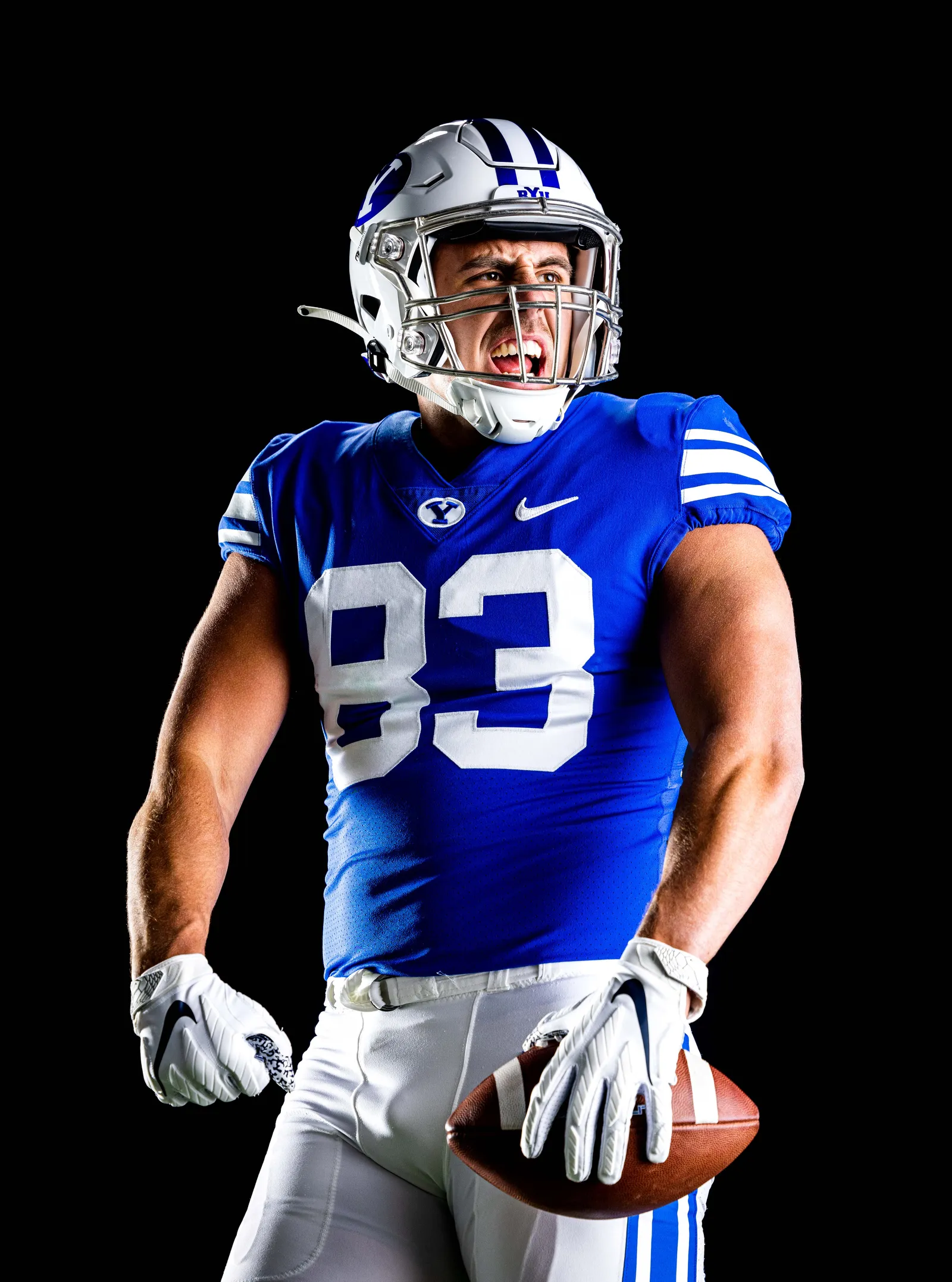 A BYU Football player shows his celebration pose in a studio photoshoot.