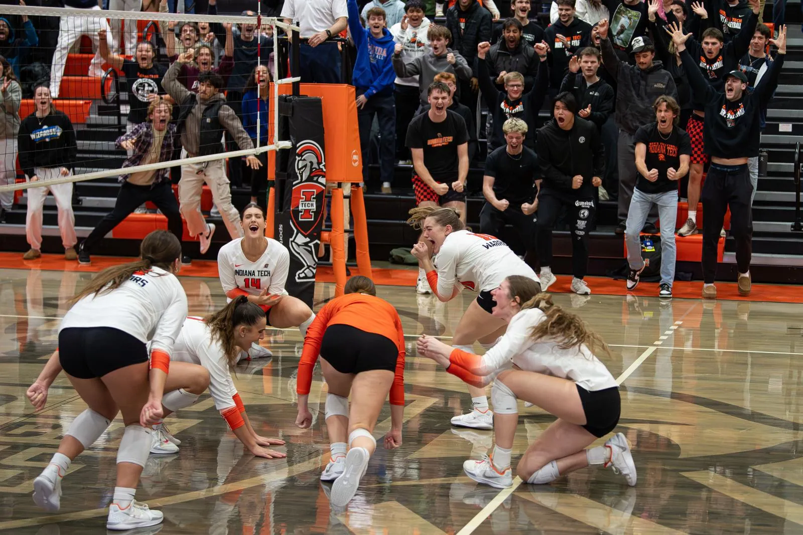 Indiana Tech Women’s s Volleyball celebrates a point to win the Conference Title matchup