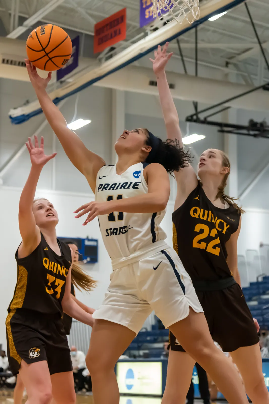 University of Illinois Springfield Prairie Star Courtland Tyus sinks a layup with two defenders on either side of her.