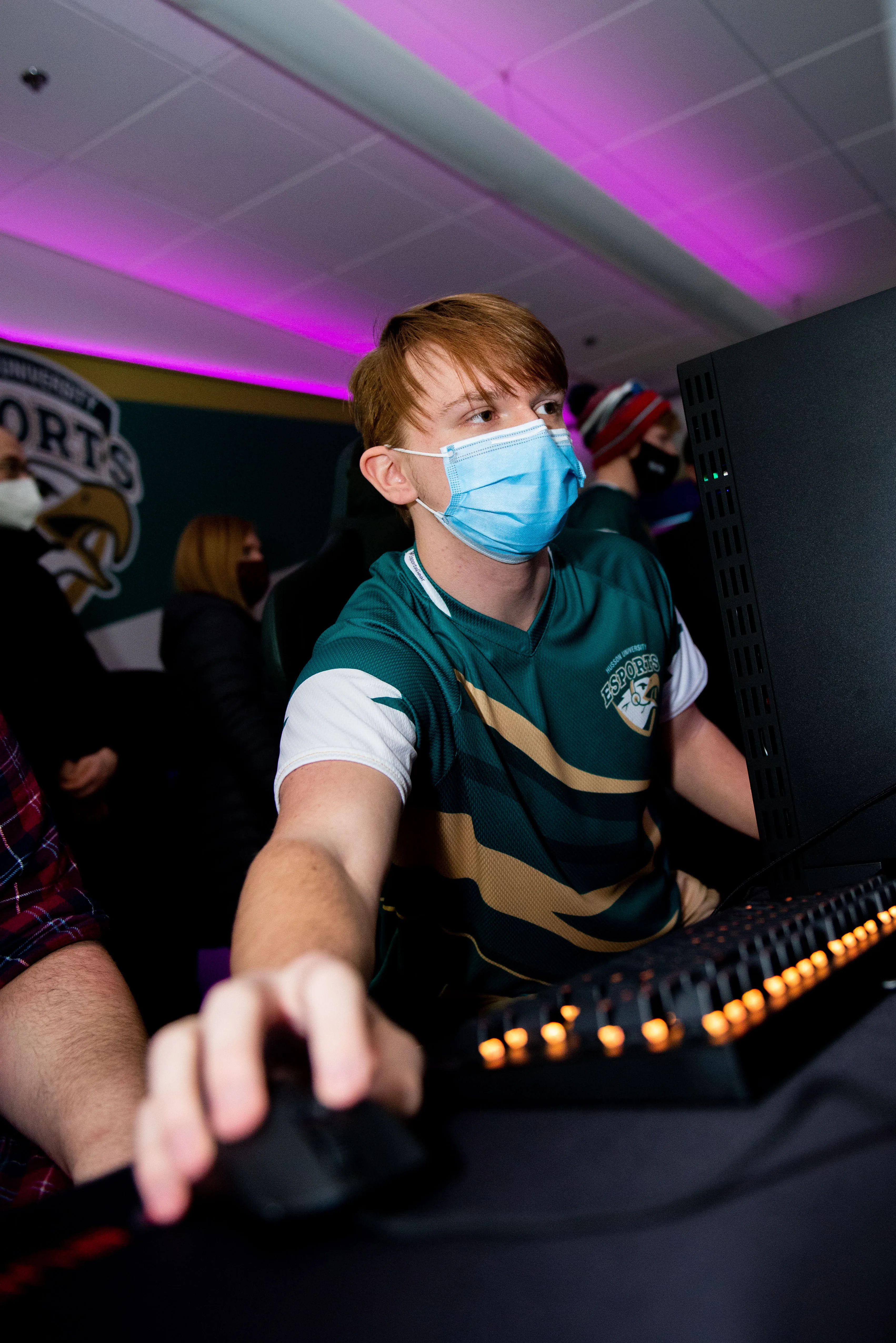 Image captured of a Husson Esports player as they prepare to play their first teacher v. student match in "Rocket League" during the opening day of the newly built Husson University Esports Center. Image Captured with Nikon D600 w/ Nikon 24-70mm + Speedlight Flash.