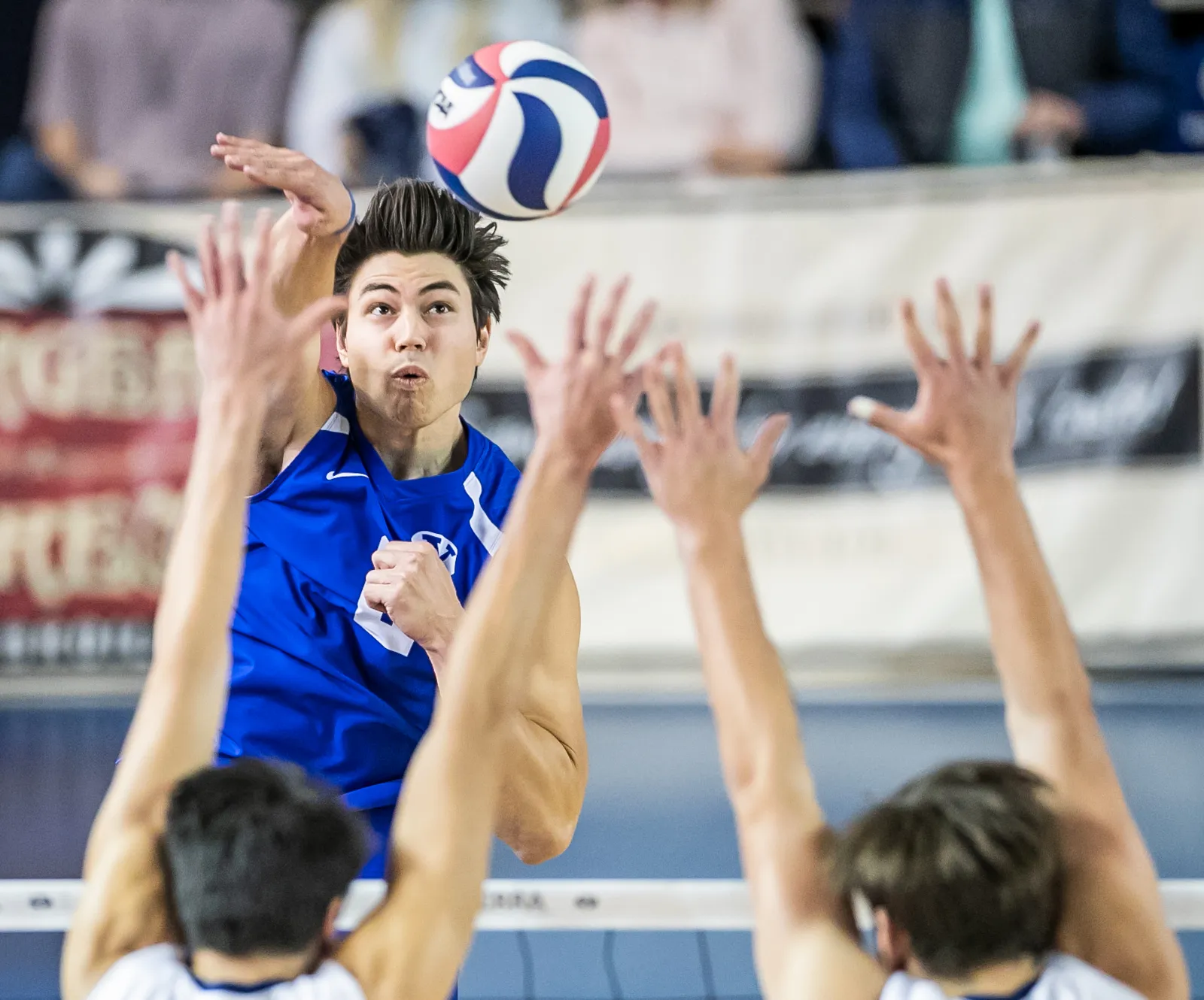 Player remains focused on the ball after he spikes it over the other team.