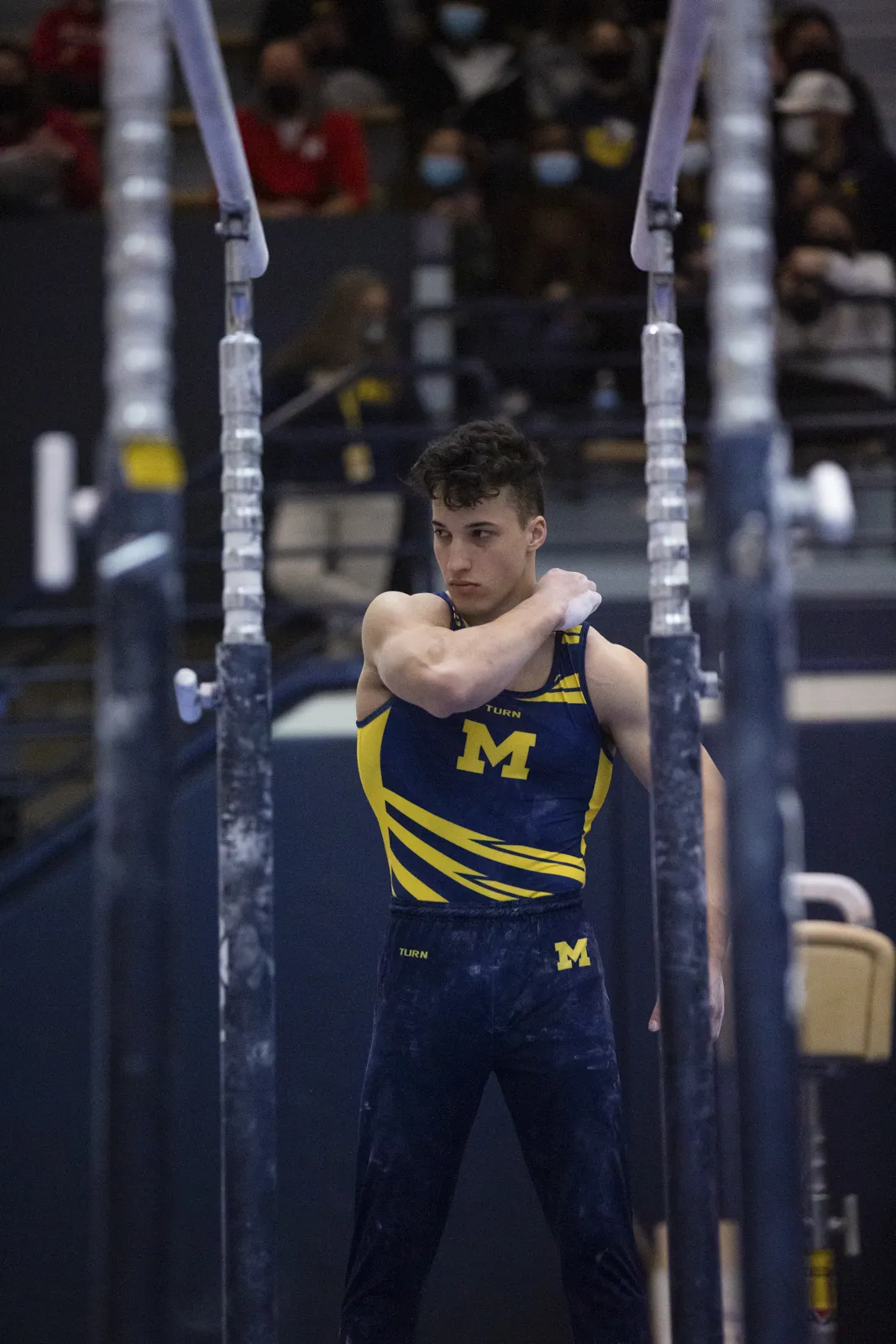 Michigan Men's Gymnast preparing to perform his routine on the double bars at Cliff Keen Arena Jan. 29, 2022.