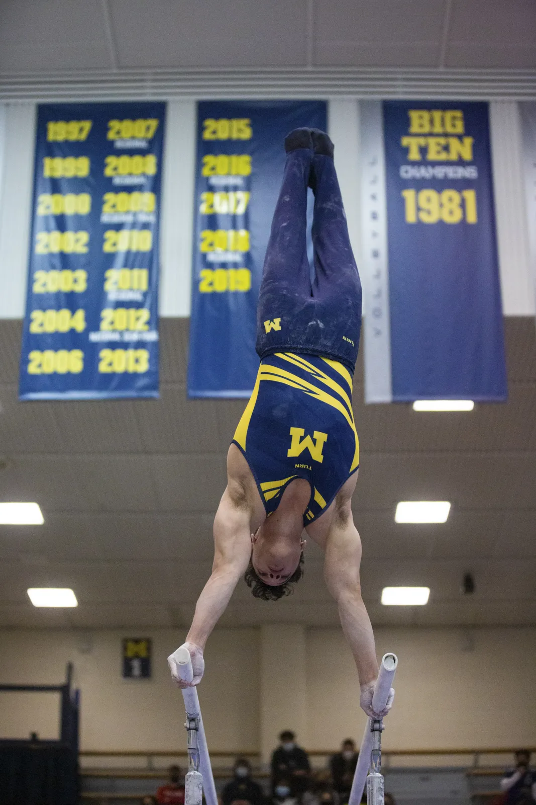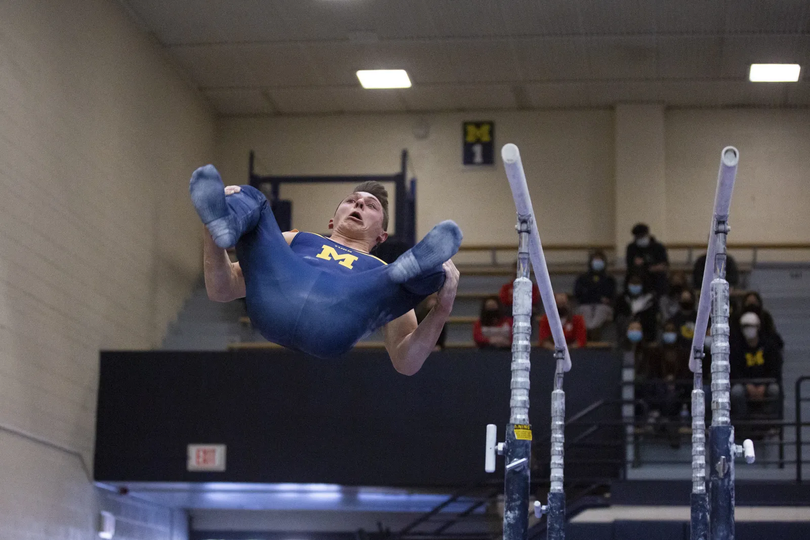 Michigan Men's Gymnast performing his routine on the double bars at Cliff Keen Arena Jan. 29, 2022.