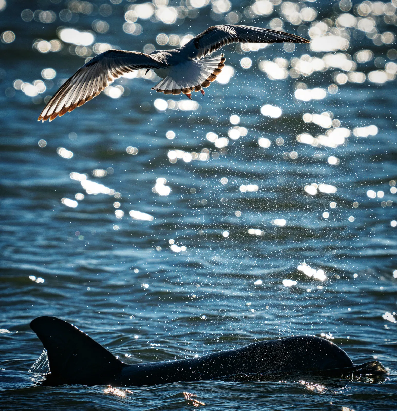 This bottlenose dolphin and shorebird had a unique relationship. The bird would land on the water and the dolphin would then surface right next to it. Then the bird would fly to the next spot and the dolphin would follow and do the same thing. I could not tell if this was a mutualistic relationship in order to capture food or if they were just playing games.