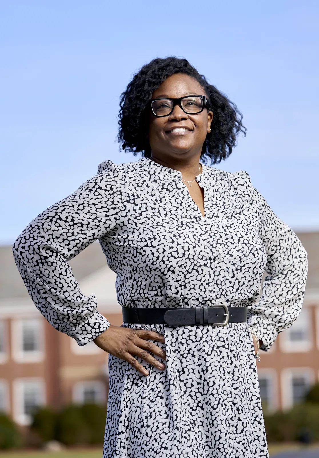 A portrait of Stonehill College's newest associate provost for diversity, Joanne Ravello, posing in front of the Duffy Academic Center.