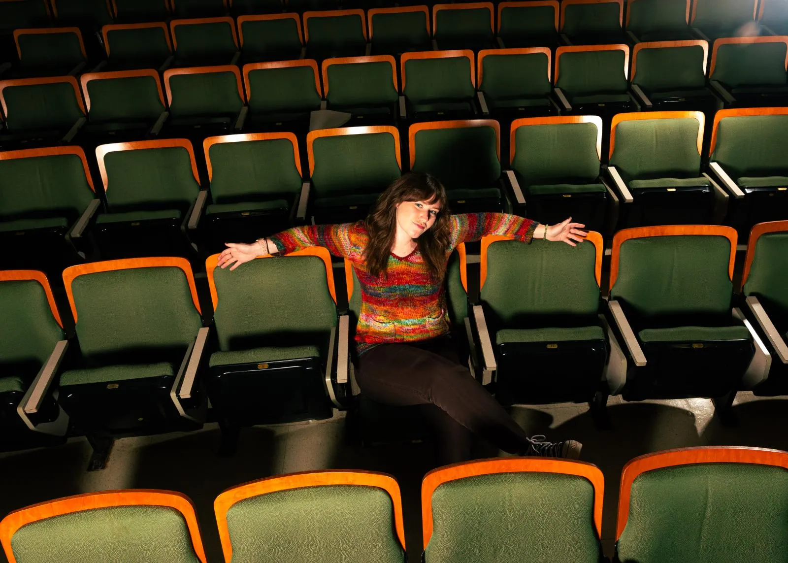 Taken during GVSU Groove's Media Day session, this image shows a member of Groove seated casually in the center of an empty auditorium.