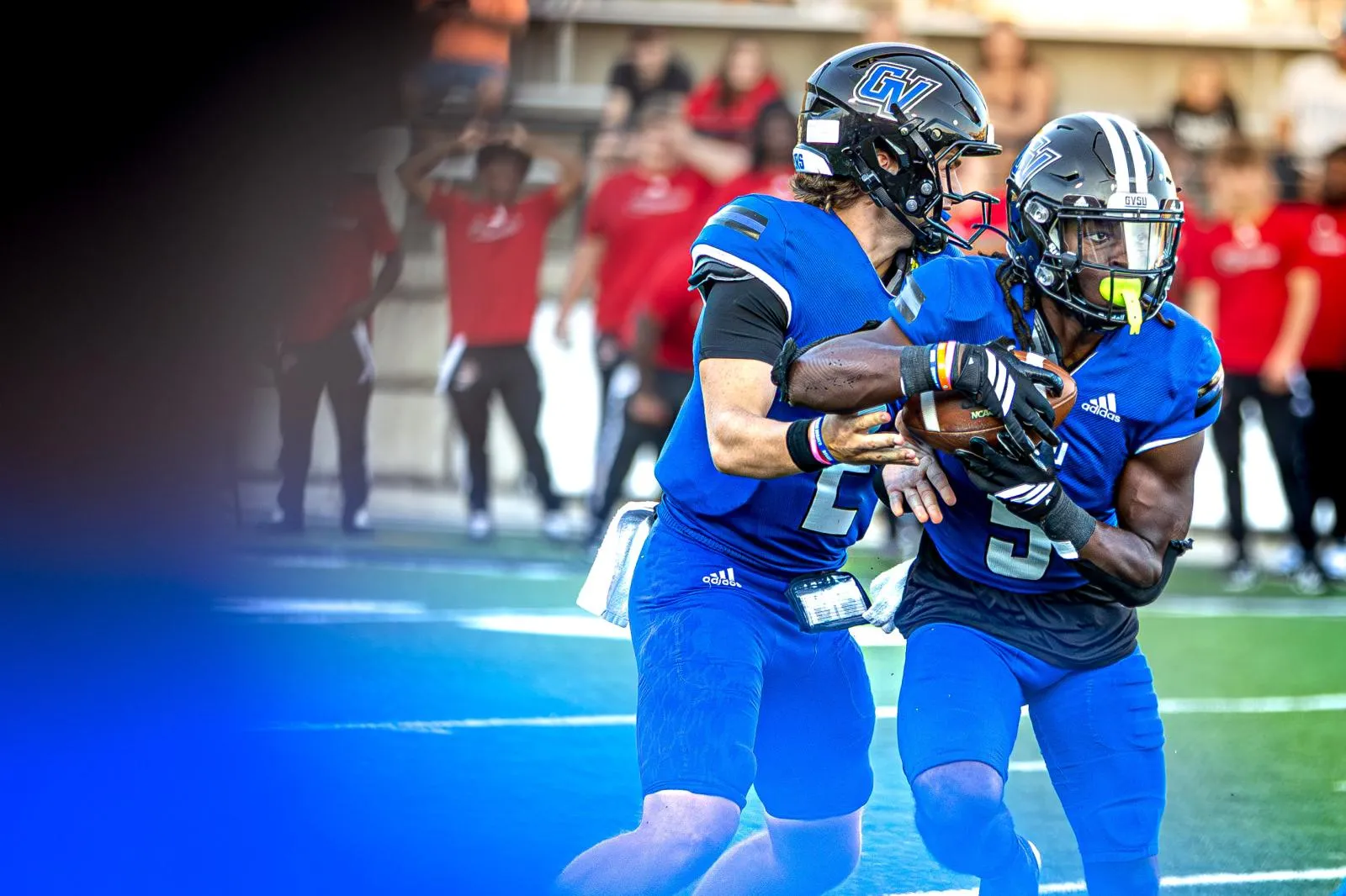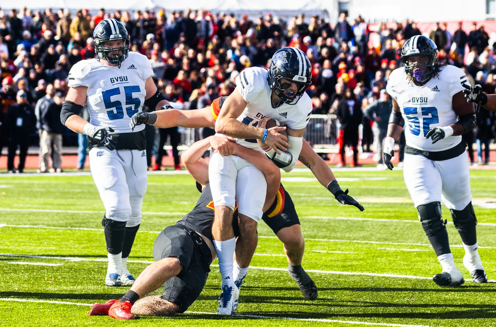 Grand Valley State quarterback hands off to runback on October 4th, against Davenport.