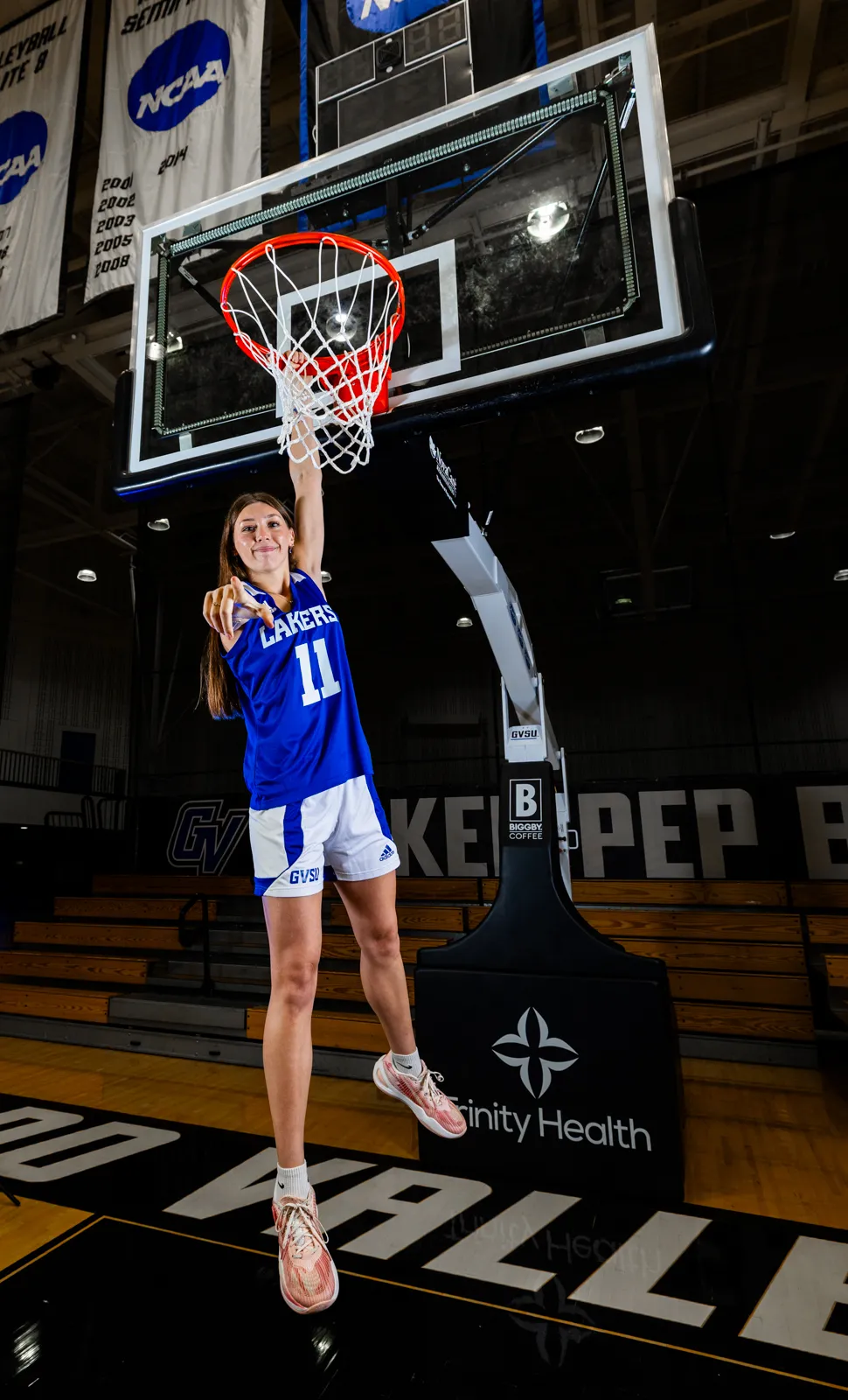 A Grand Valley Women's Club Basketball athlete hangs on the rim and points toward the camera during media day. Shot on Canon R6 Mark 2.