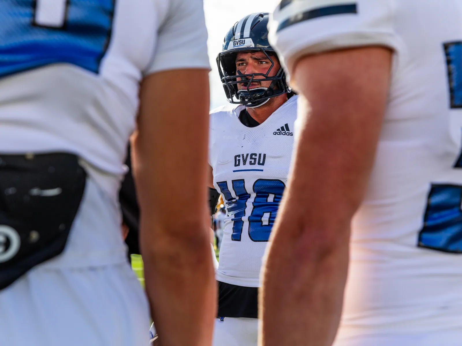 Grand Valley State linebacker Anthony Cardamone (48) is seen through a narrow gap between teammates as he listens to his coach during a game against Ferris State at Top Taggart Field on Oct. 25. Shot on a Canon R6 Mark II.