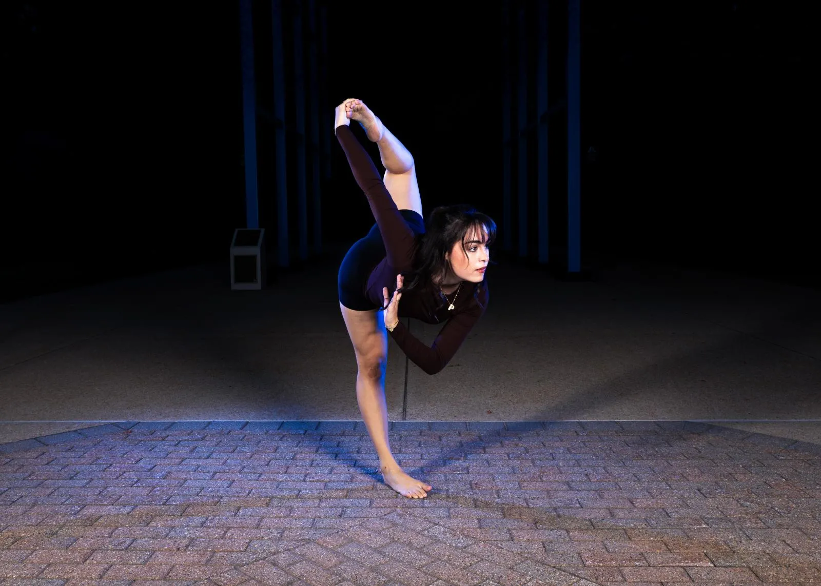 Photographed during GVSU Elite Dance's media day, this image showcases one dancer in the scorpion pose.