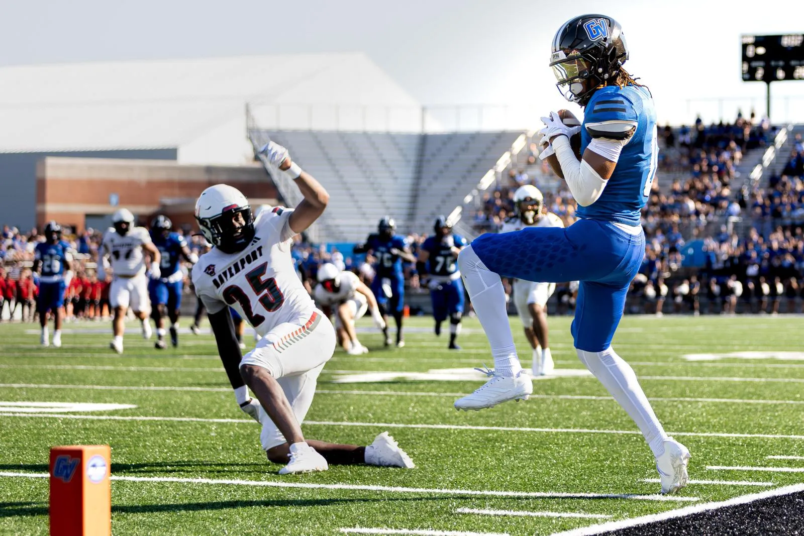 Grand Valley State player tip toes into the touchdown zone, as Davenport player is helpless to stop him on October 4th.