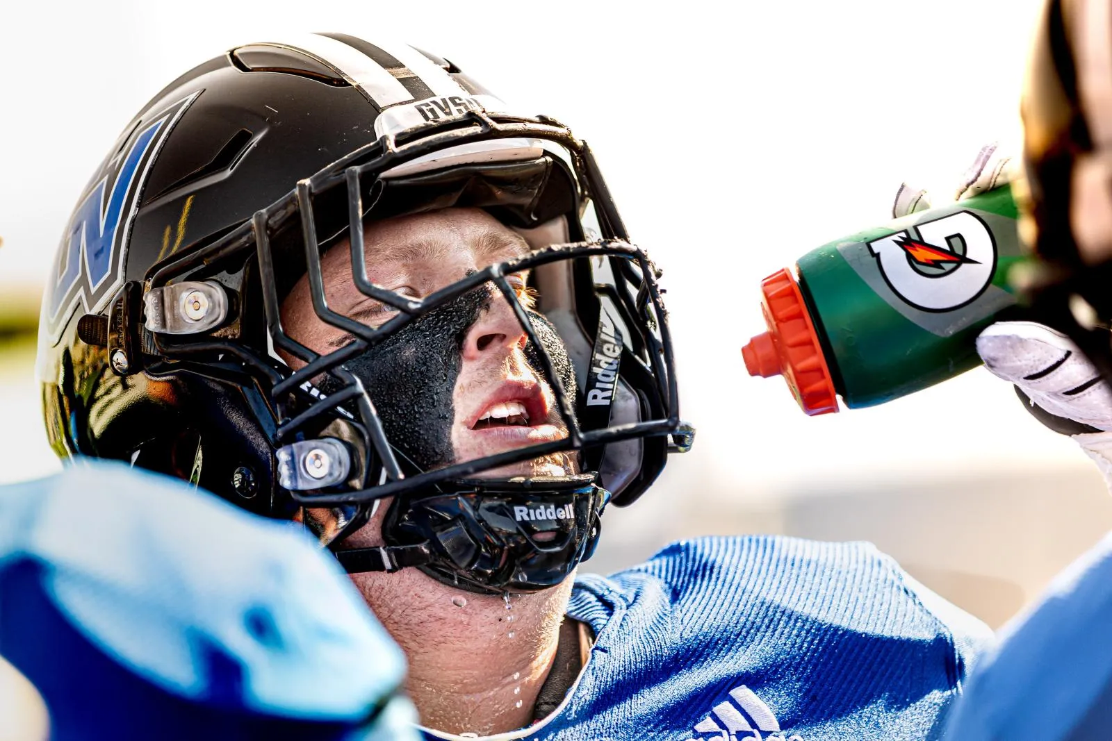 Grand Valley State player getting a drink to beat the heat against Davenport on October 4th.