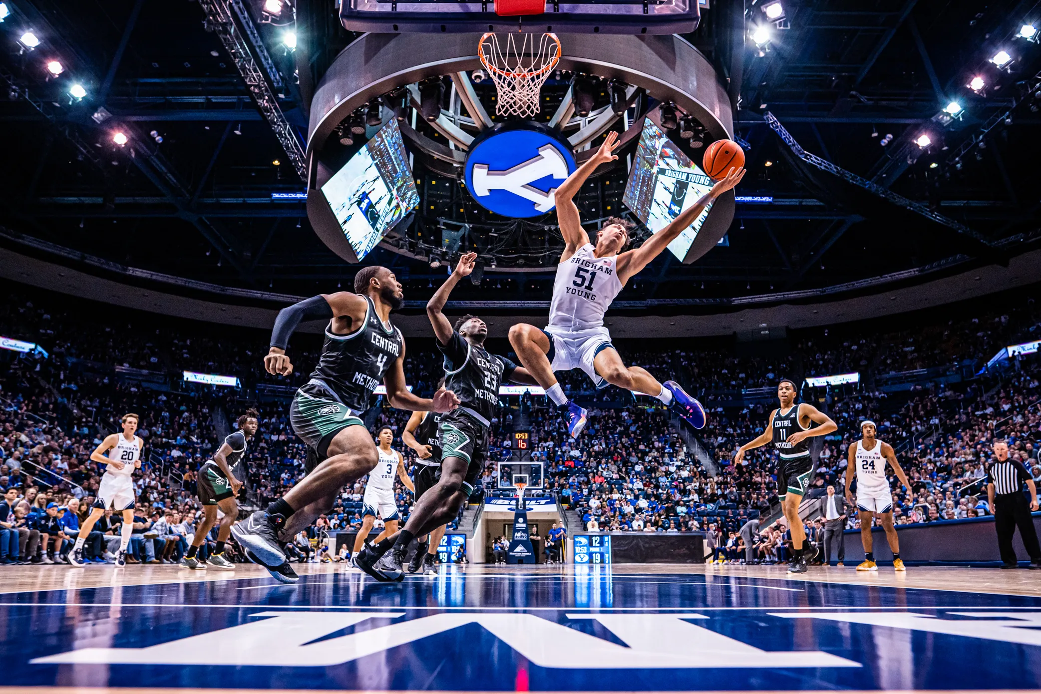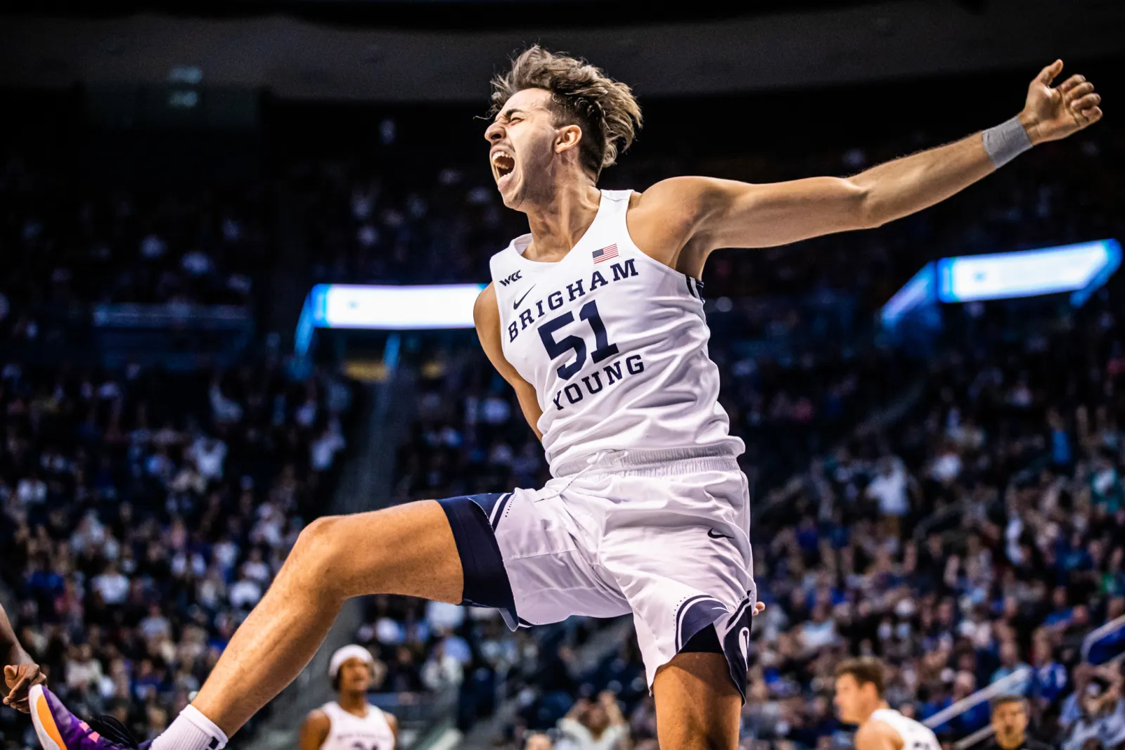 BYU's Gavin Baxter reaching out to grab the rebound after a shot from a teammate.
