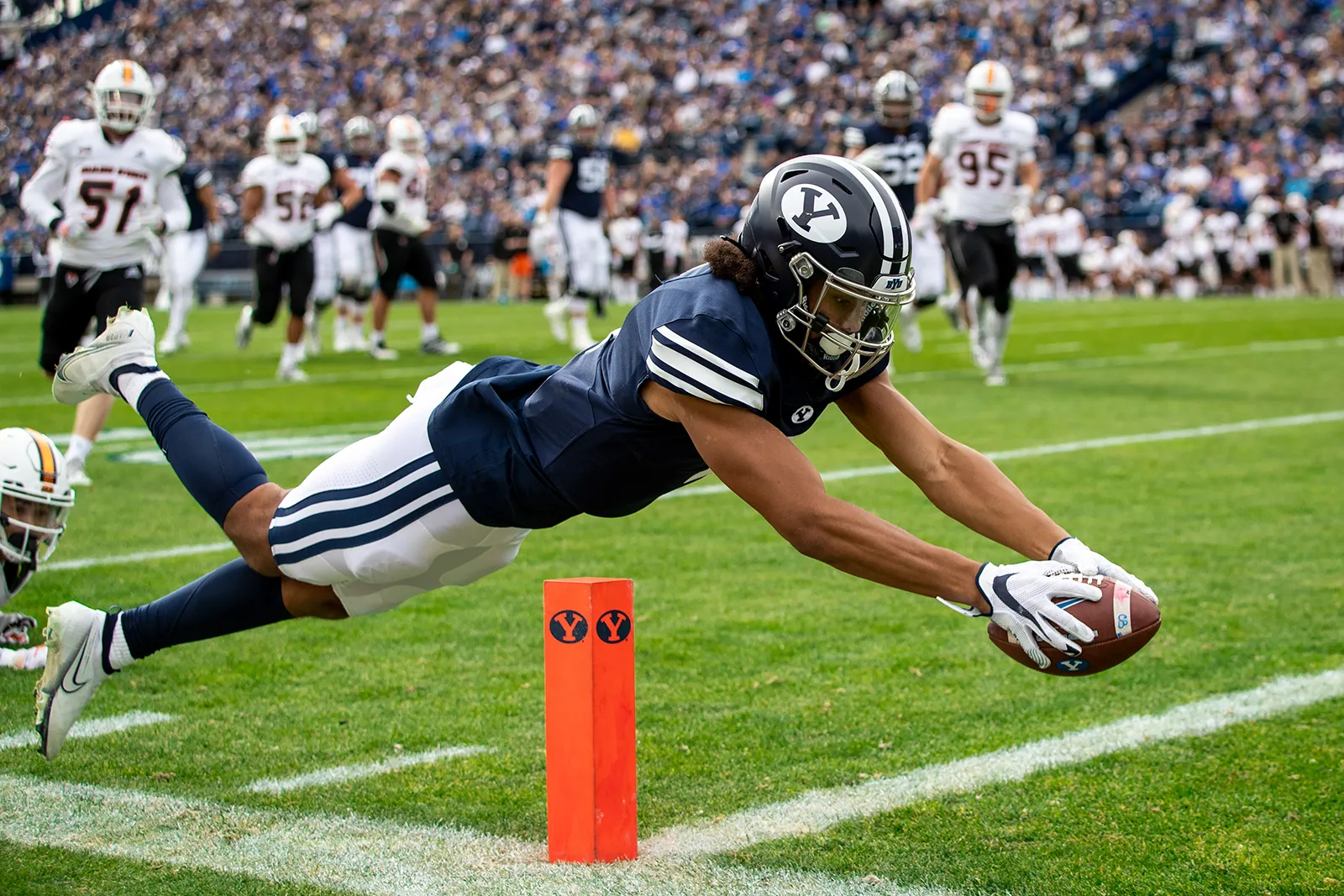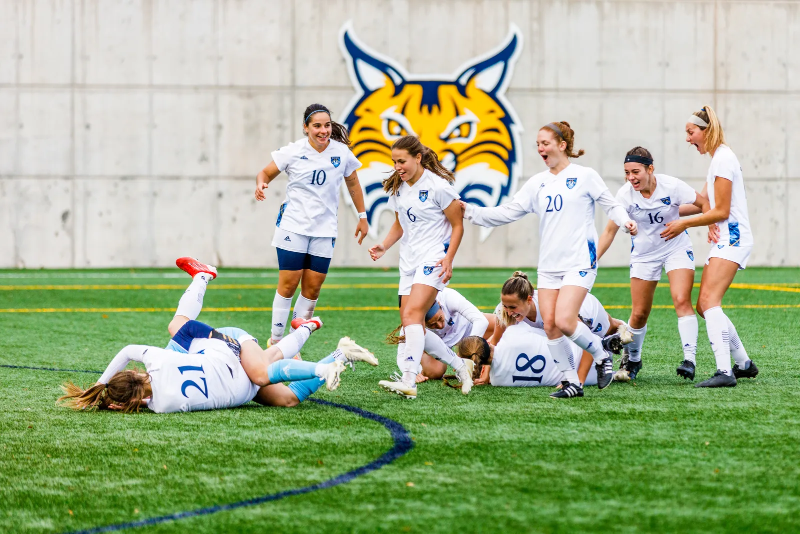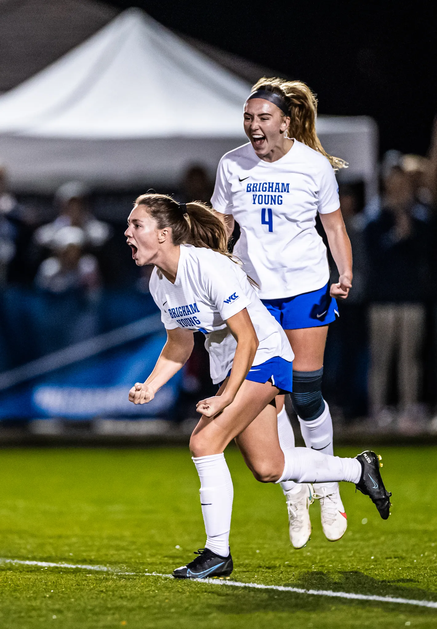 BYU Women's Soccer player celebrates after scoring a goal in a game leading up to the national title match.