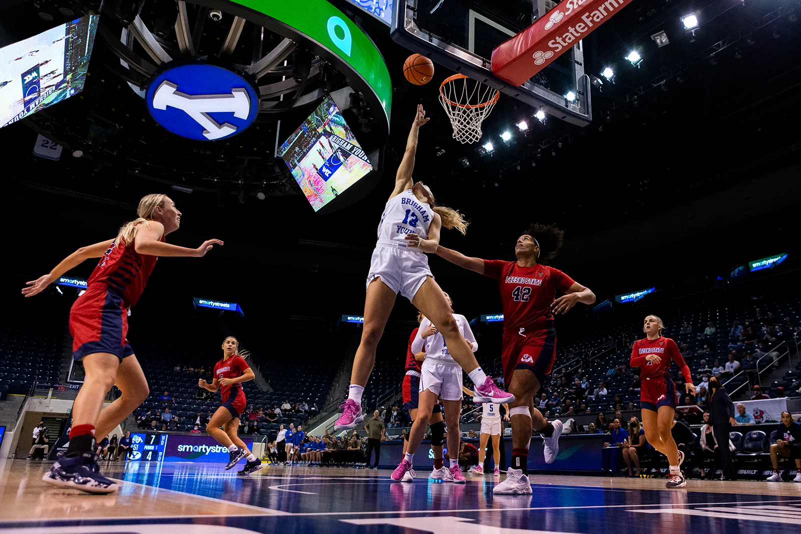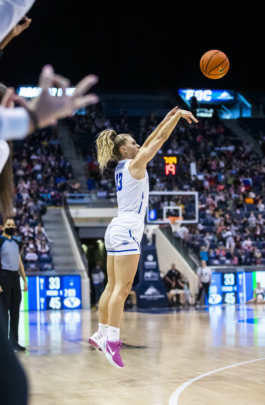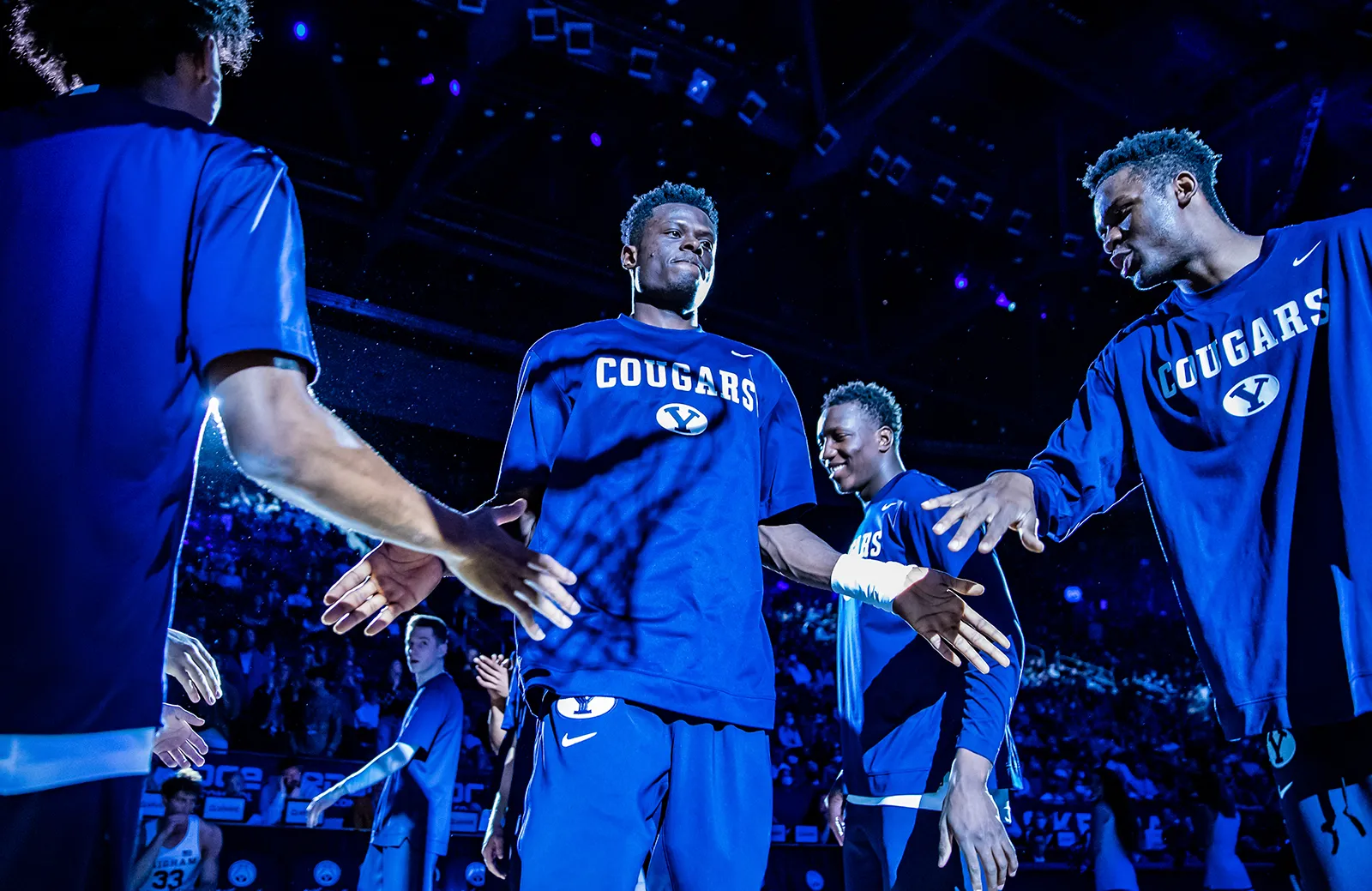 Player entering the court in the starting line up. Back lit by the lights of the arena with strong shadows.