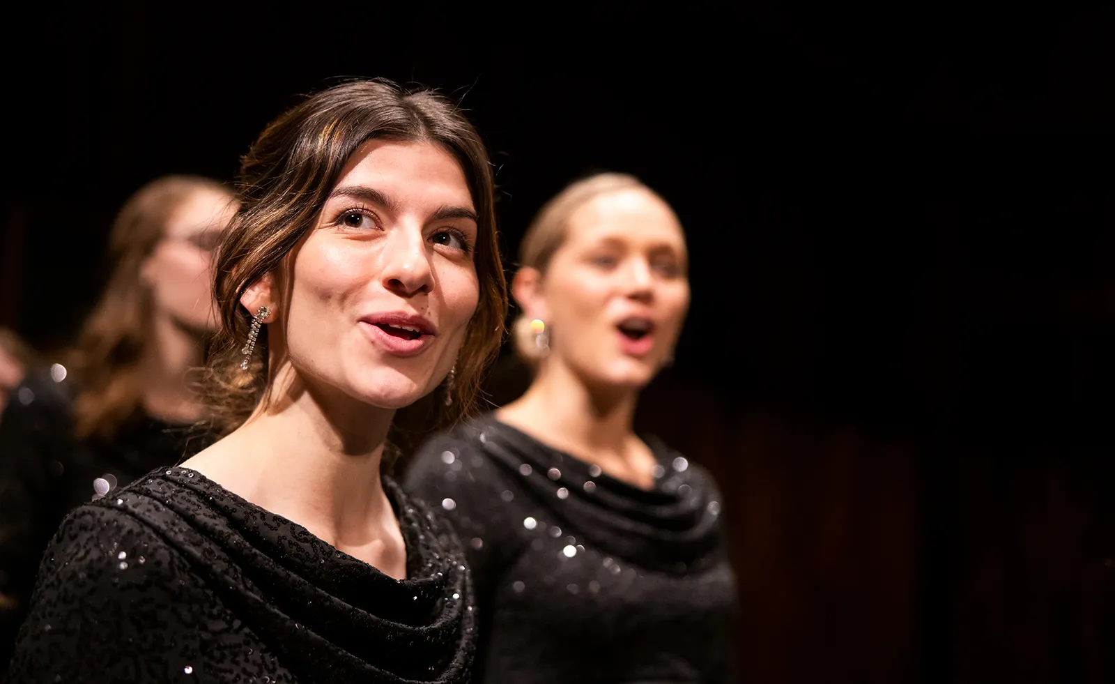 Student performer focuses on the fifth row as she sings in the concert choir at her university.