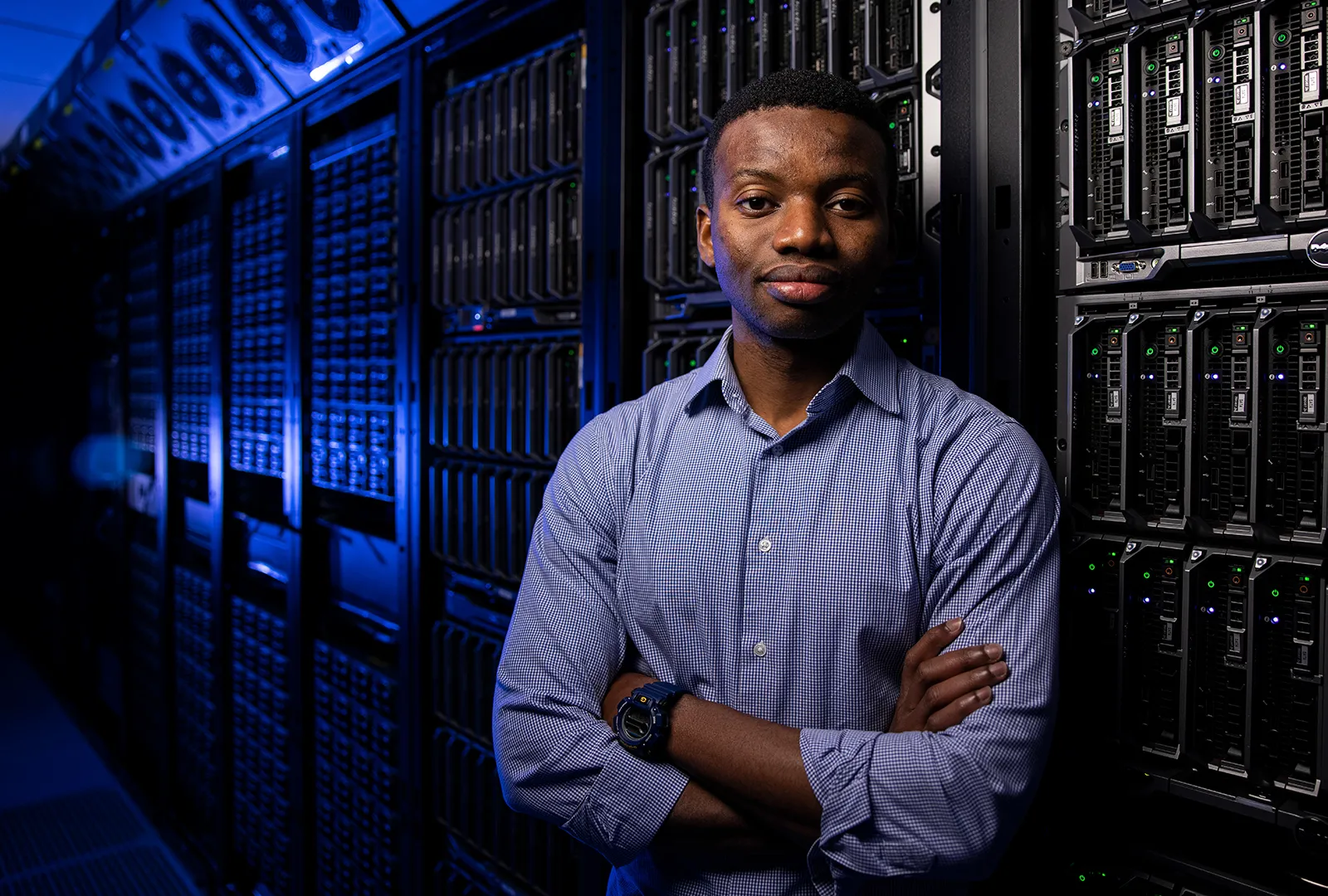 Computer science student earns accolade in his studies. This photo was taken in a server room with a key light and back light using a blue gel.