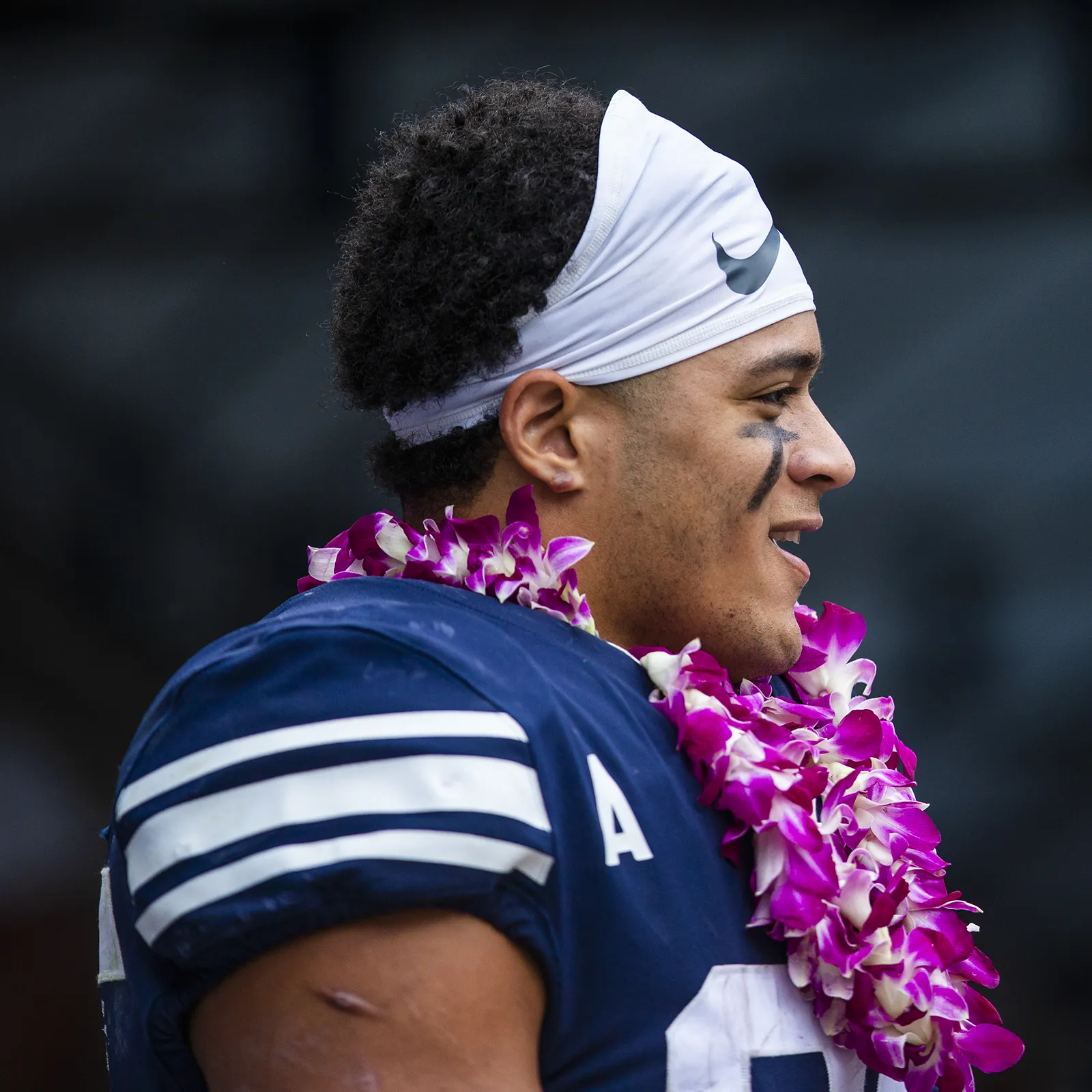 Side profile of an athlete after a football game.