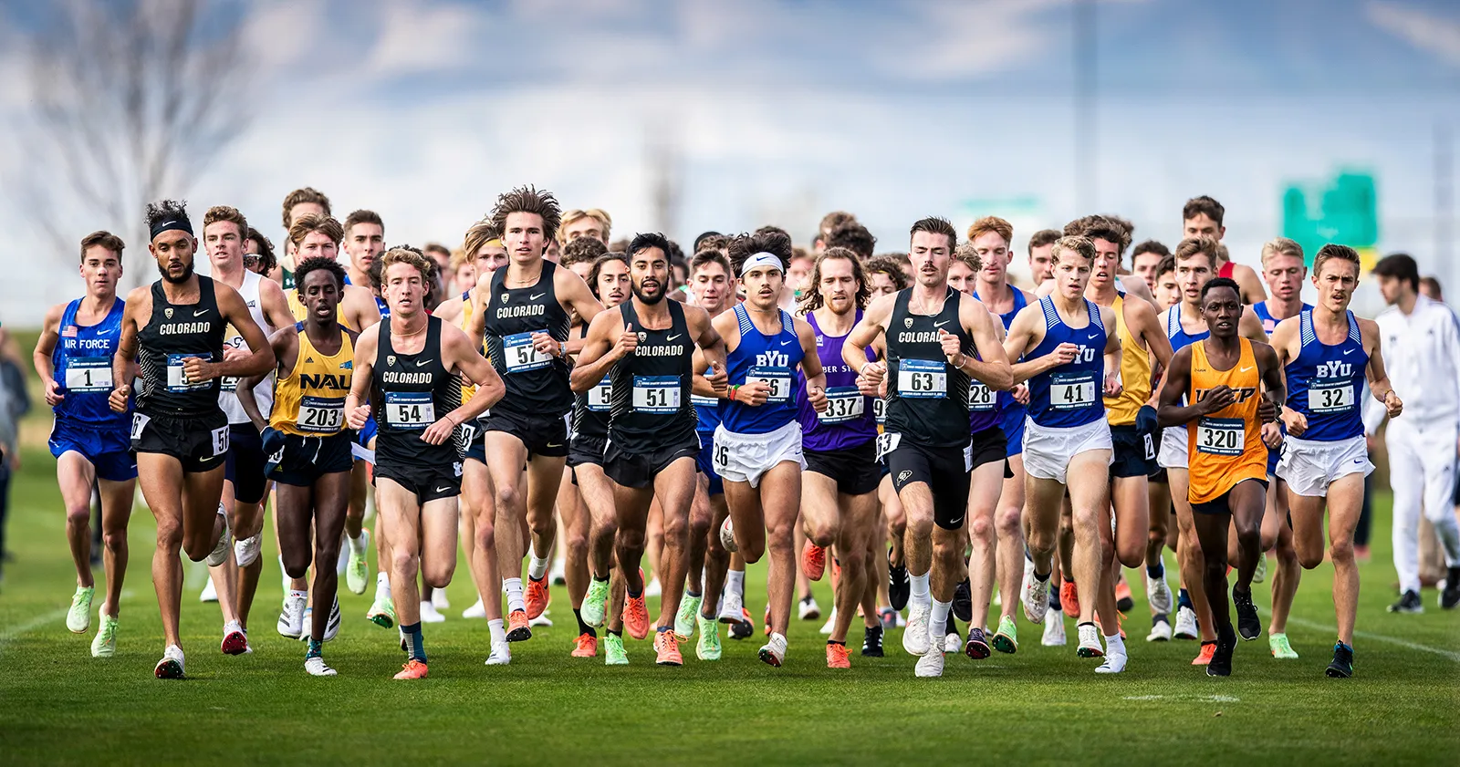 Straight on image of the leading pack of runners at the Mountain Regional cross country meet.