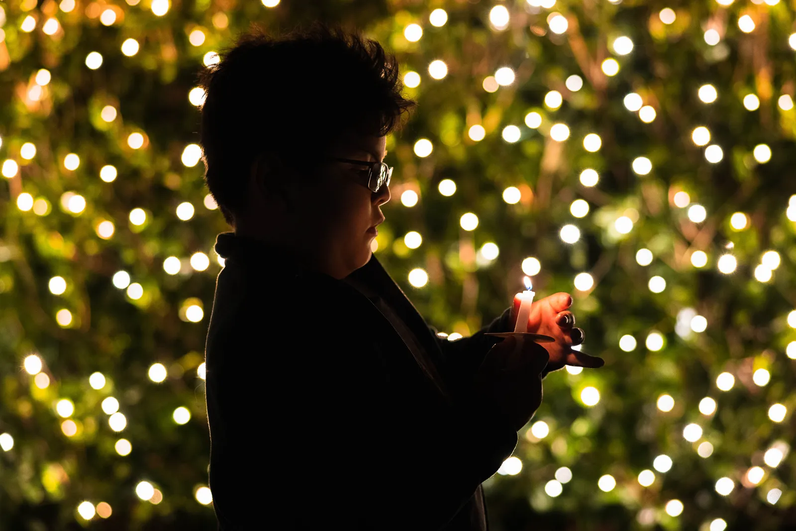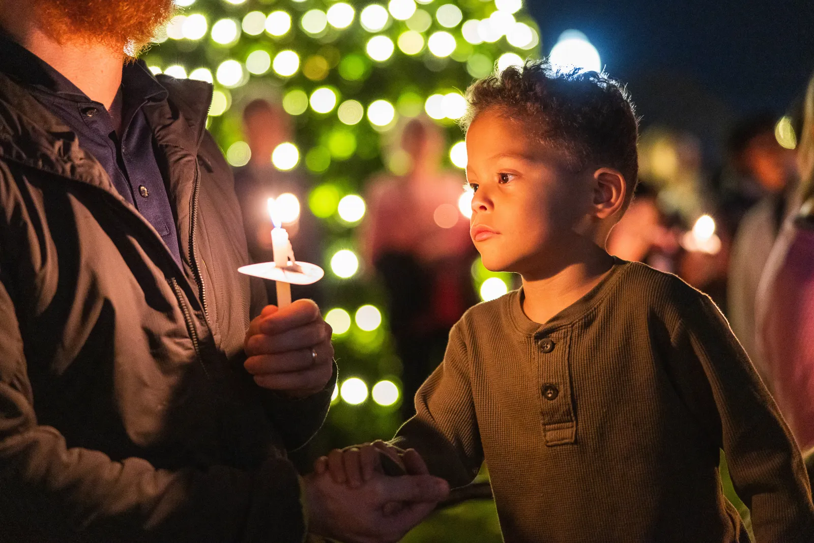 A candid photo of a child holding a candle at the Christmas lighting celebration.