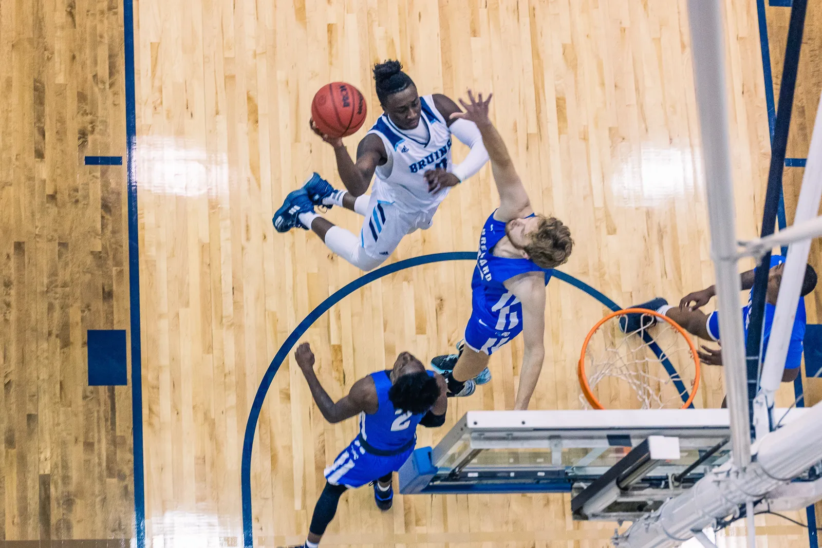 Junior #10 Devin Dean pulls off an acrobatic layup during a regular season game.