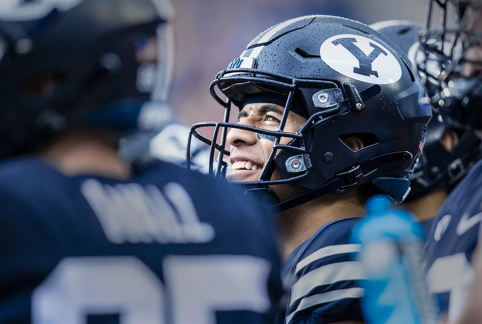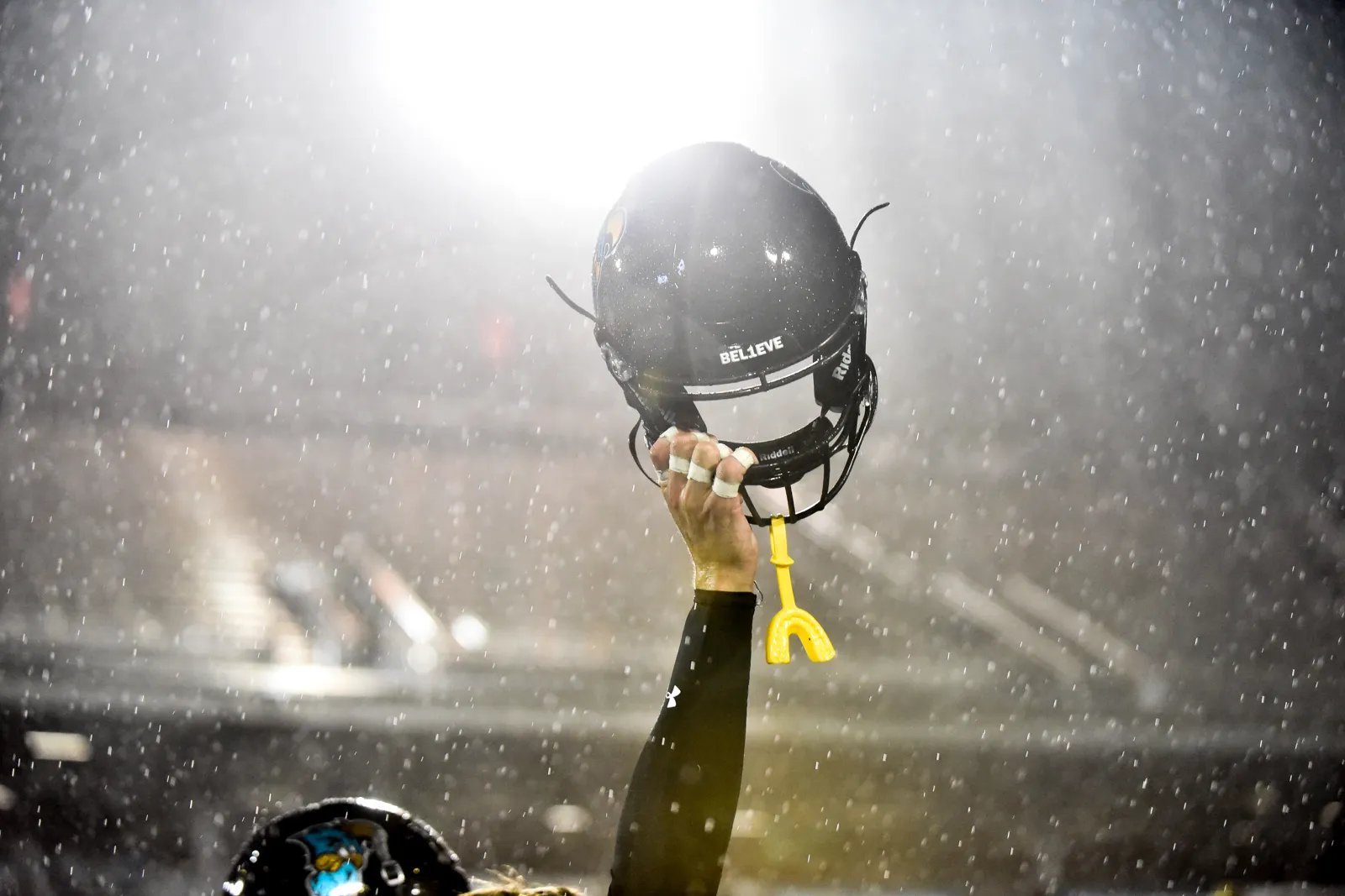 Coastal Carolina University's football team won against Troy. One player celebrated the victory by holding his helmet up in the rain.